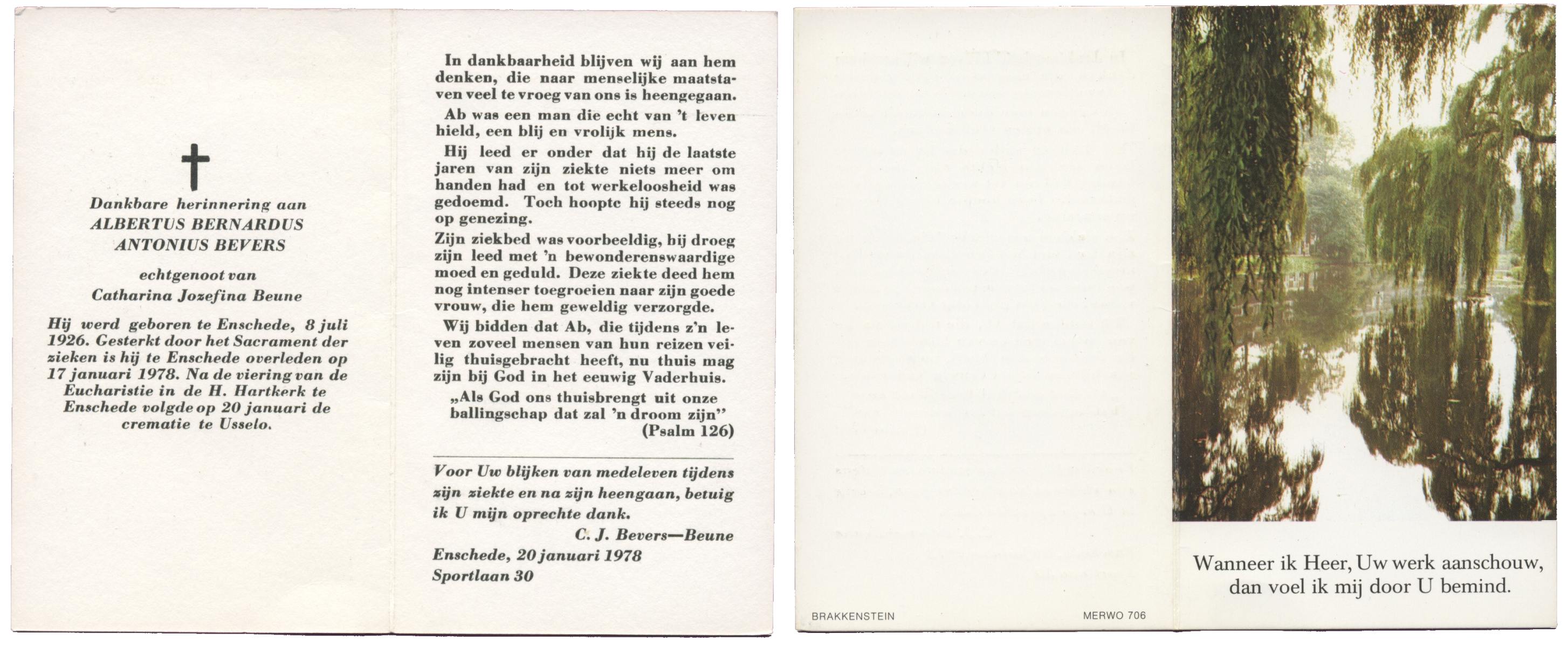 BEVERS, Albertus Bernardus Antonius, geboren op 8-7-1926 te Enschede, overleden op 17-1-1978 te Enschede op 51-jarige leeftijd, gecremeerd op 20-1-1978 te Usselo.
