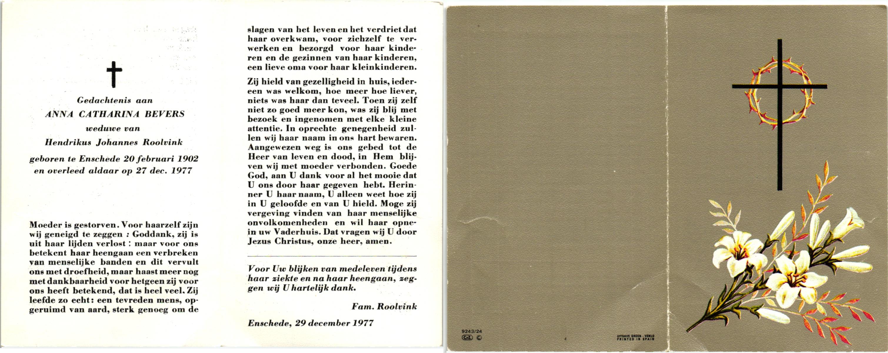 BEVERS, Anna Catharina, geboren op 20-2-1902 te Enschede, overleden op 27-12-1977 te Enschede op 75-jarige leeftijd.