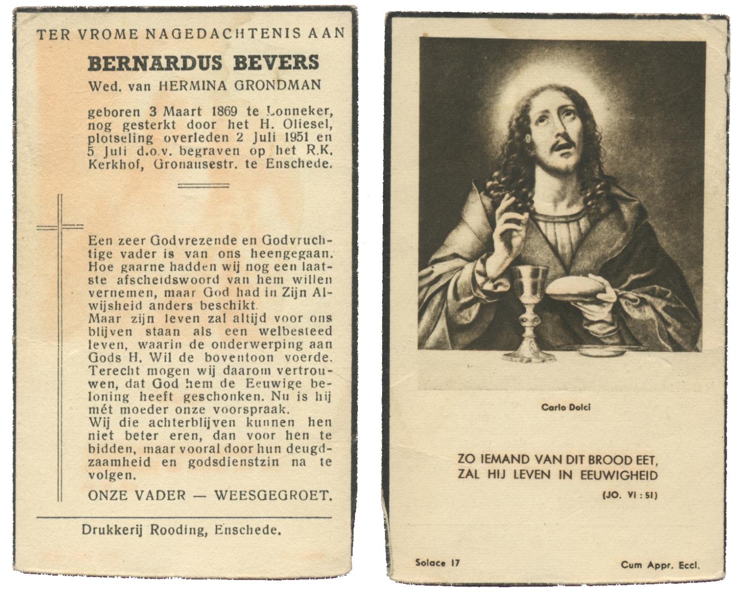 BEVERS, Bernardus, geboren op 03-03-1869 te Lonneker, overleden op 2-7-1951 op 82-jarige leeftijd, begraven op 5-7-1951 te Enschede R.K.Kerhof Gronausestraat.