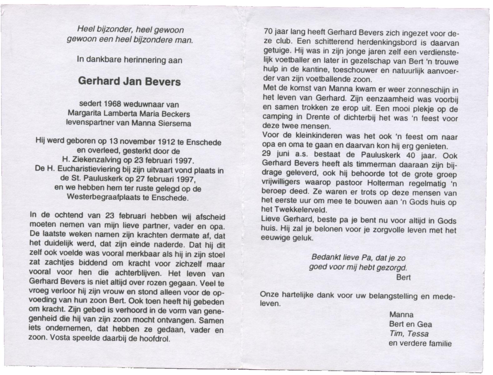 BEVERS, Gerhard Jan, geboren op 13-11-1912 te Enschede, overleden op 23-2-1997 op 84-jarige leeftijd, begraven op 27-2-1997 te Enschede.