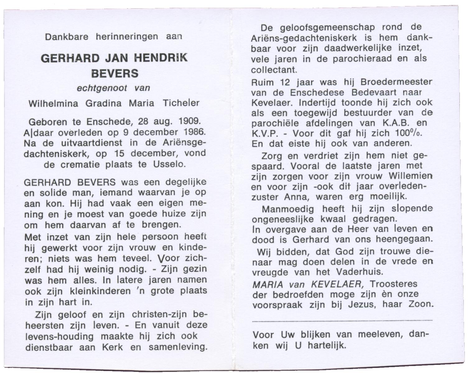 BEVERS, Gerhard Jan Hendrik, geboren op 28-8-1909 te Enschede, overleden op 9-12-1986 te Enschede op 77-jarige leeftijd, gecremeerd op 15-12-1986 te Usselo.