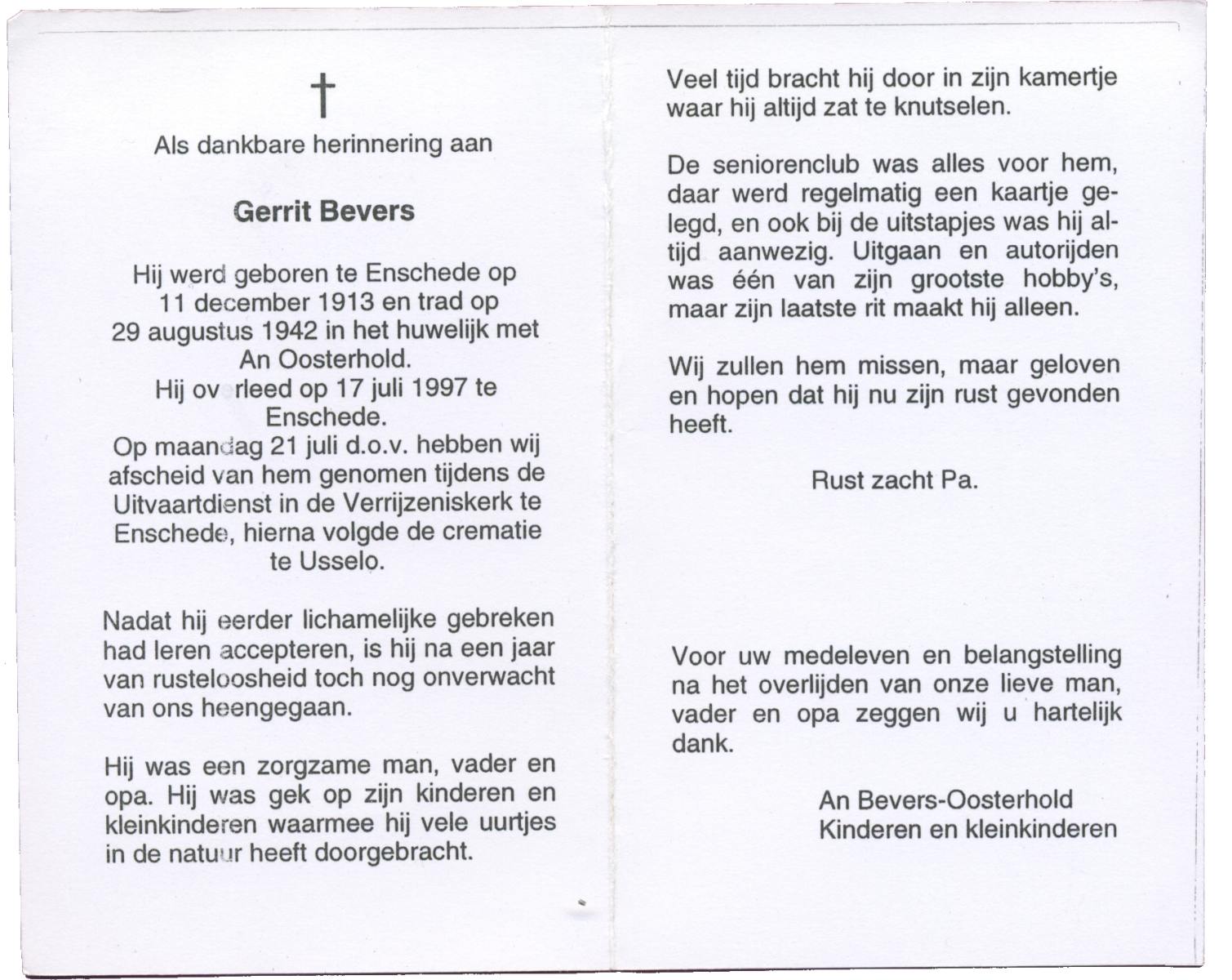BEVERS, Gerrit, geboren op 11-12-1913 te Enschede, overleden op 17-7-1997 te Enschede op 83-jarige leeftijd, gecremeerd op 21-7-1997 te Usselo.