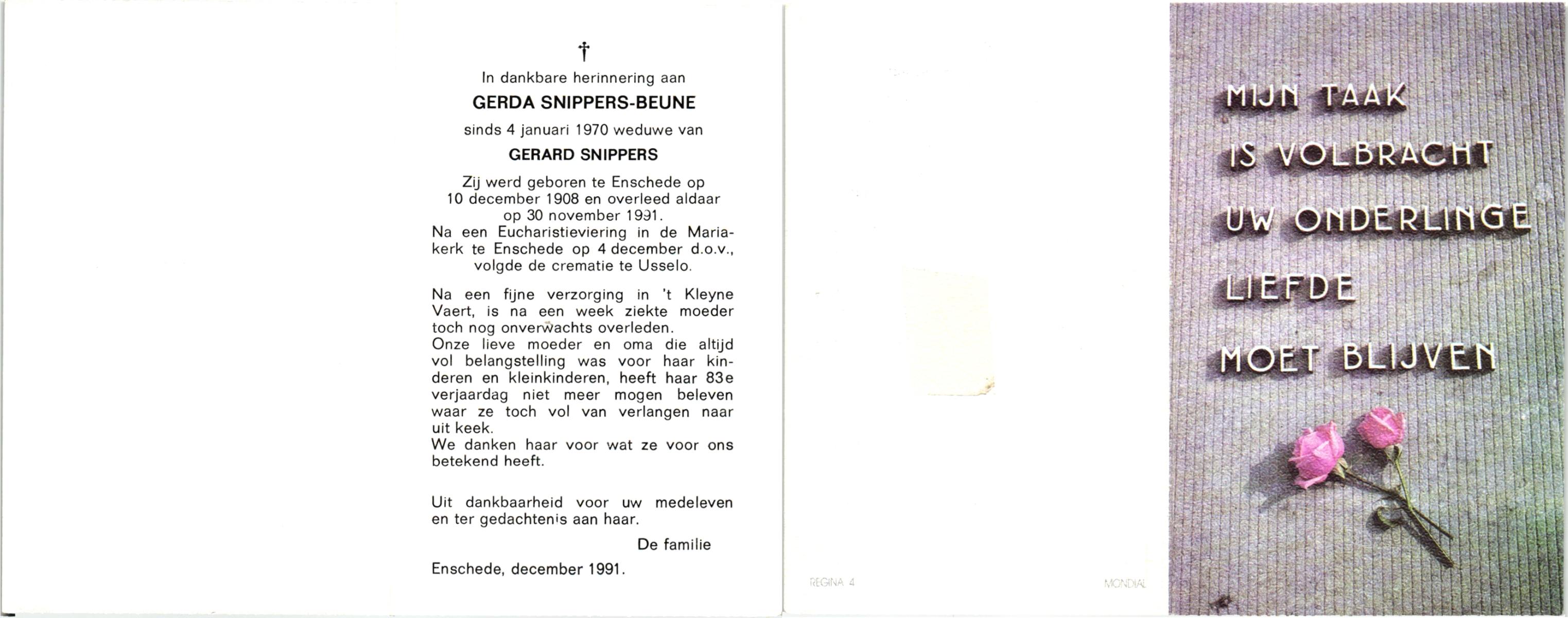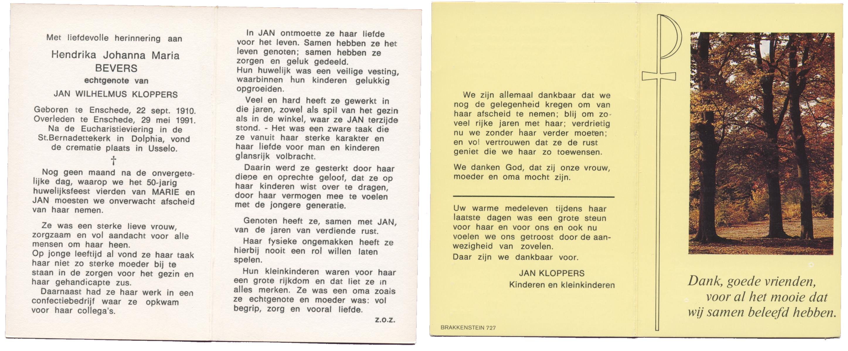 BEVERS, Hendrika Johanna Maria, geboren op 22-9-1910 te Enschede, overleden op 29-5-1991 te Enschede op 80-jarige leeftijd, gecremeerd te Usselo.
