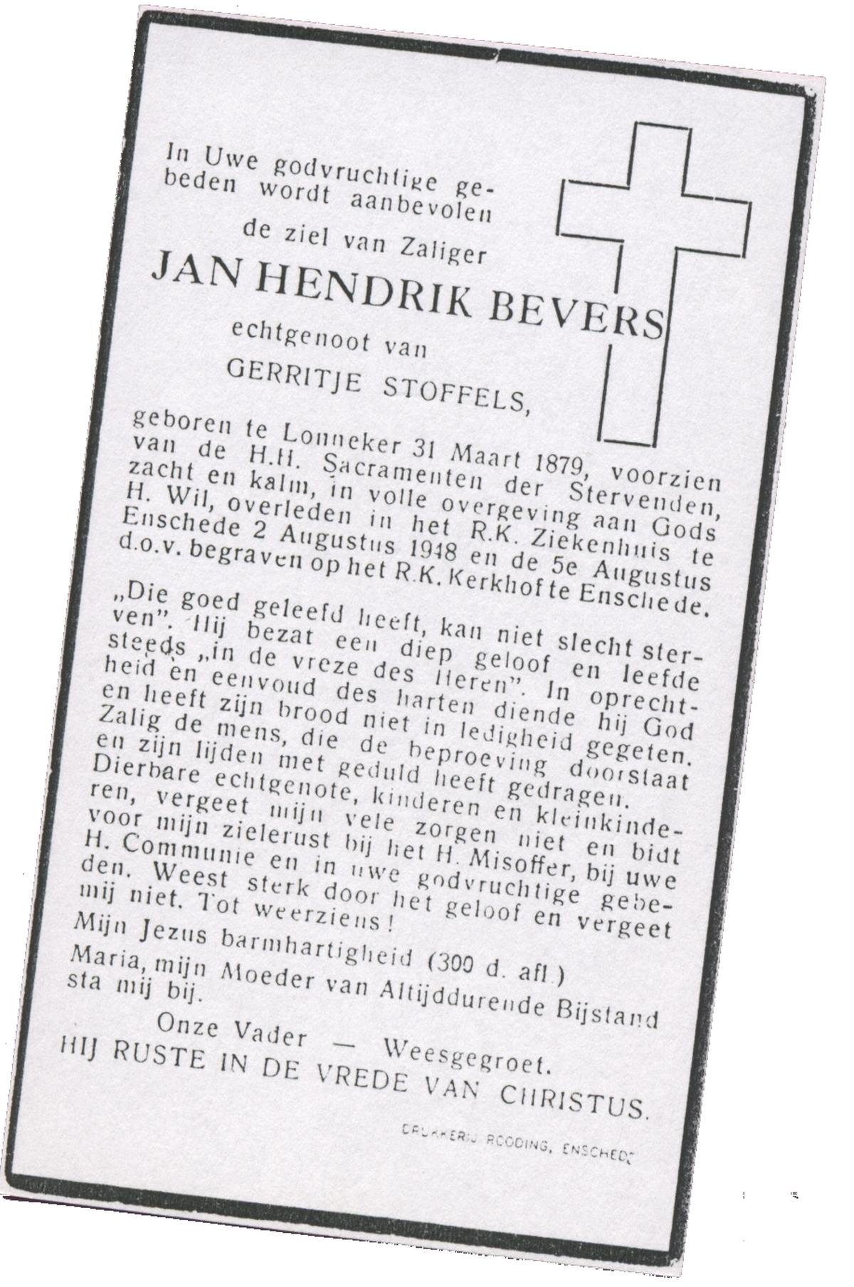 BEVERS, Jan Hendrik, geboren op 31-03-1879 te Lonneker, overleden op 2-8-1948 te Enschede op 69-jarige leeftijd, begraven op 5-8-1948 te Enschede.