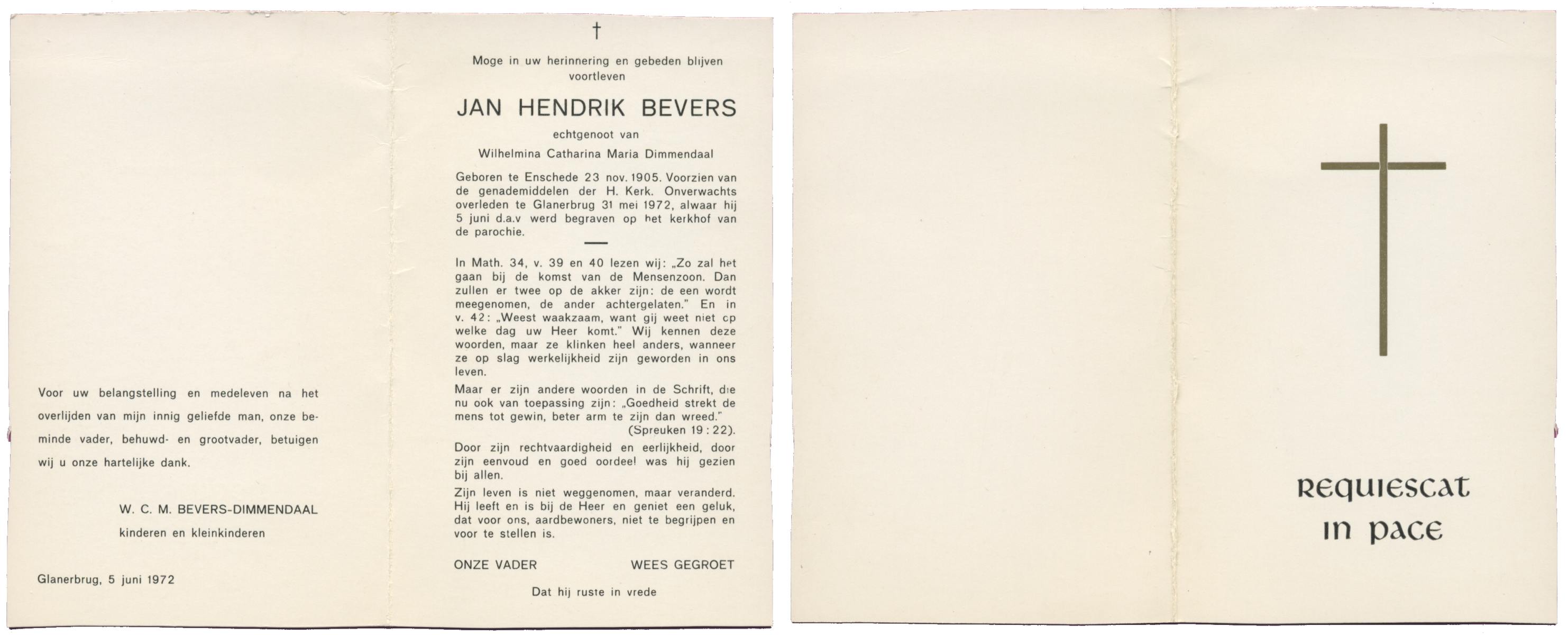 BEVERS, Jan Hendrik, geboren op 23-11-1905 te Enschede, overleden op 31-5-1972 te Glanerbrug op 66-jarige leeftijd, begraven op 5-6-1972 te Glanerbrug.