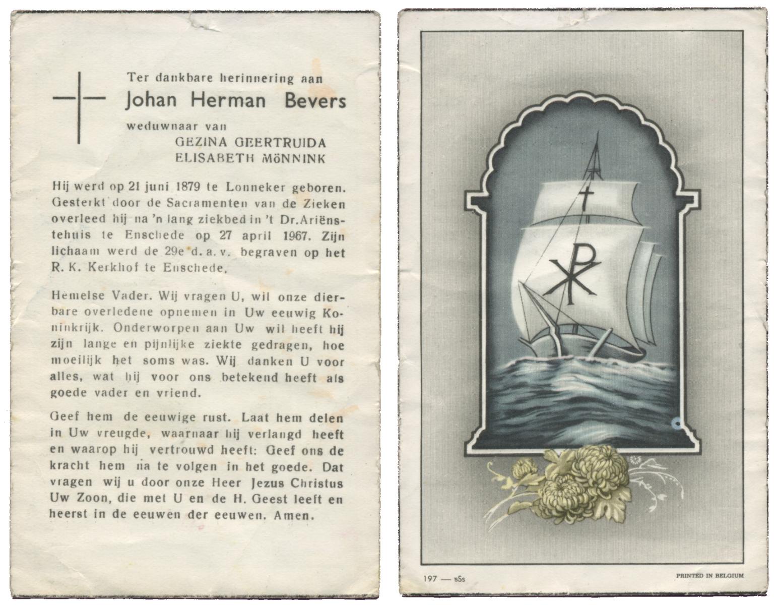 BEVERS, Johan Herman, geboren op 21-06-1879 te Lonneker, overleden op 27-4-1967 te Enschede op 87-jarige leeftijd, begraven op 29-4-1967 te Enschede R.K.Kerhof.