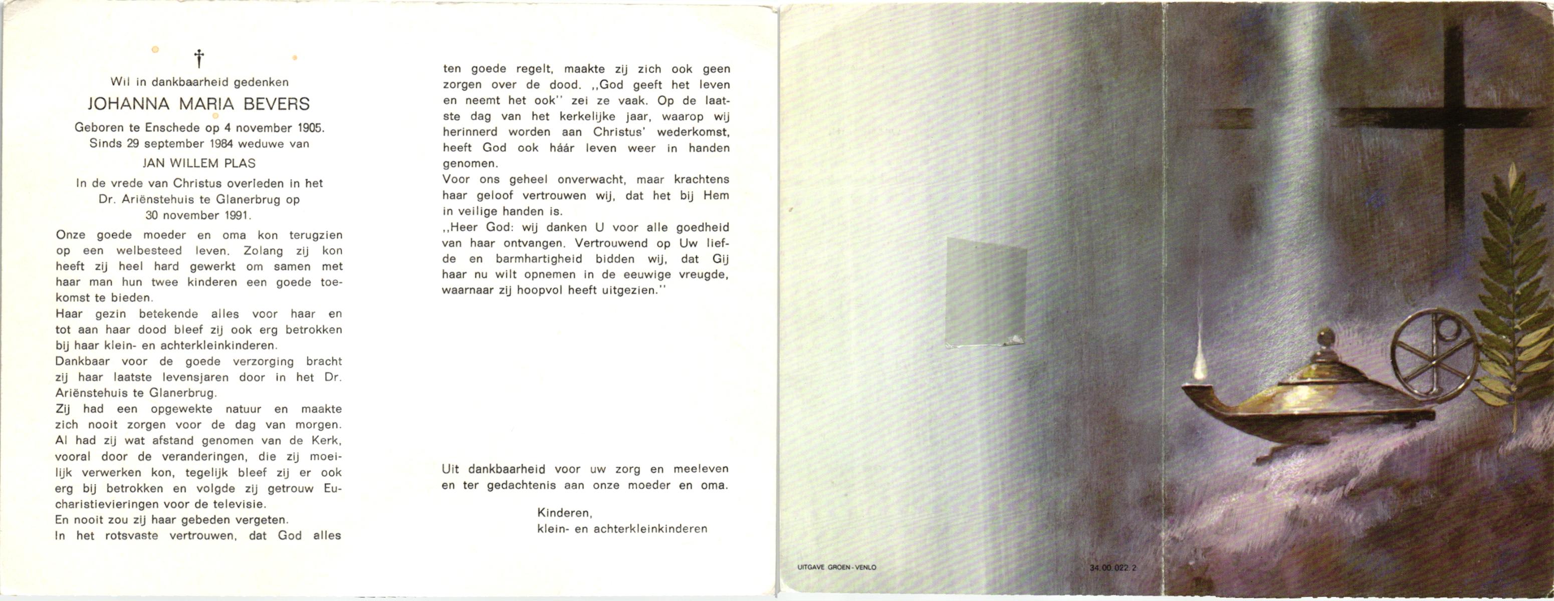 BEVERS, Johanna Maria, geboren op 4-11-1905 te Enschede, overleden op 30-11-1991 te Glanerburg op 86-jarige leeftijd.