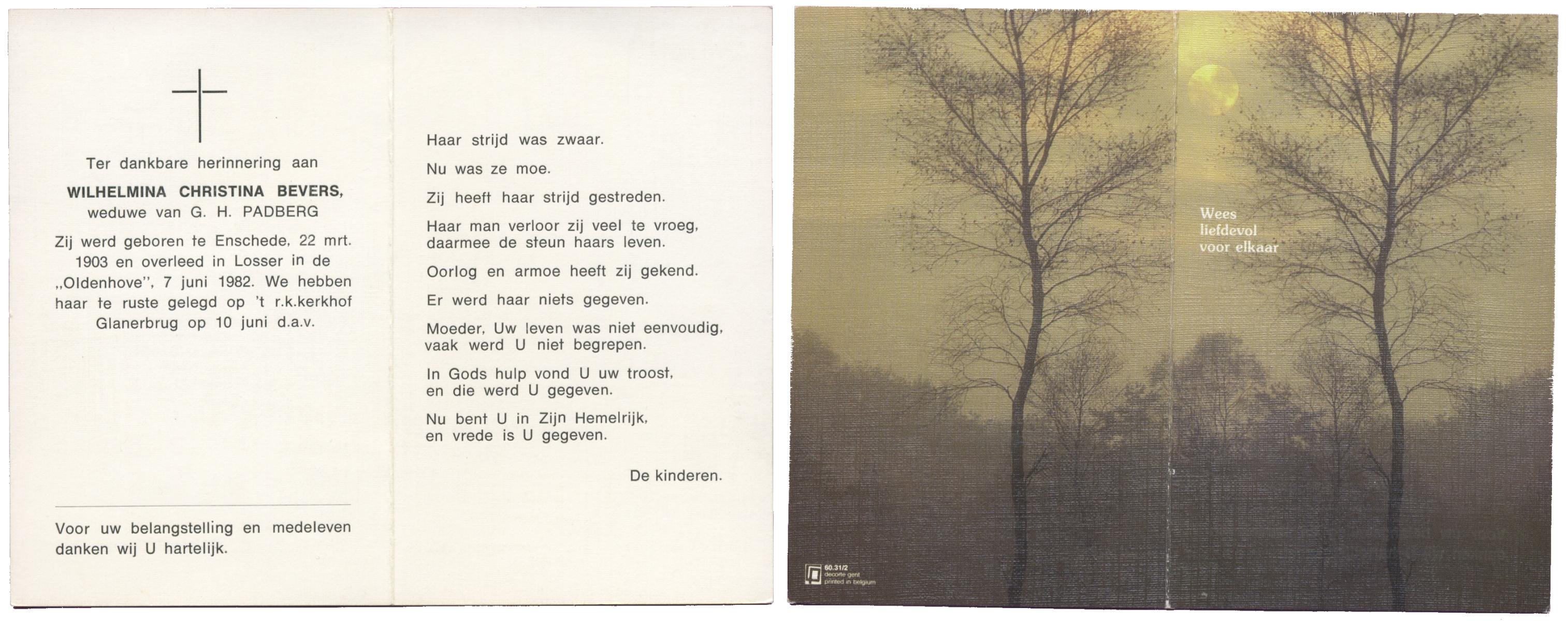 BEVERS, Wilhelmina Christina, geboren op 22-3-1903 te Enschede, overleden op 7-6-1982 te Losser op 79-jarige leeftijd, begraven op 10-6-1982 te Glanerbrug.