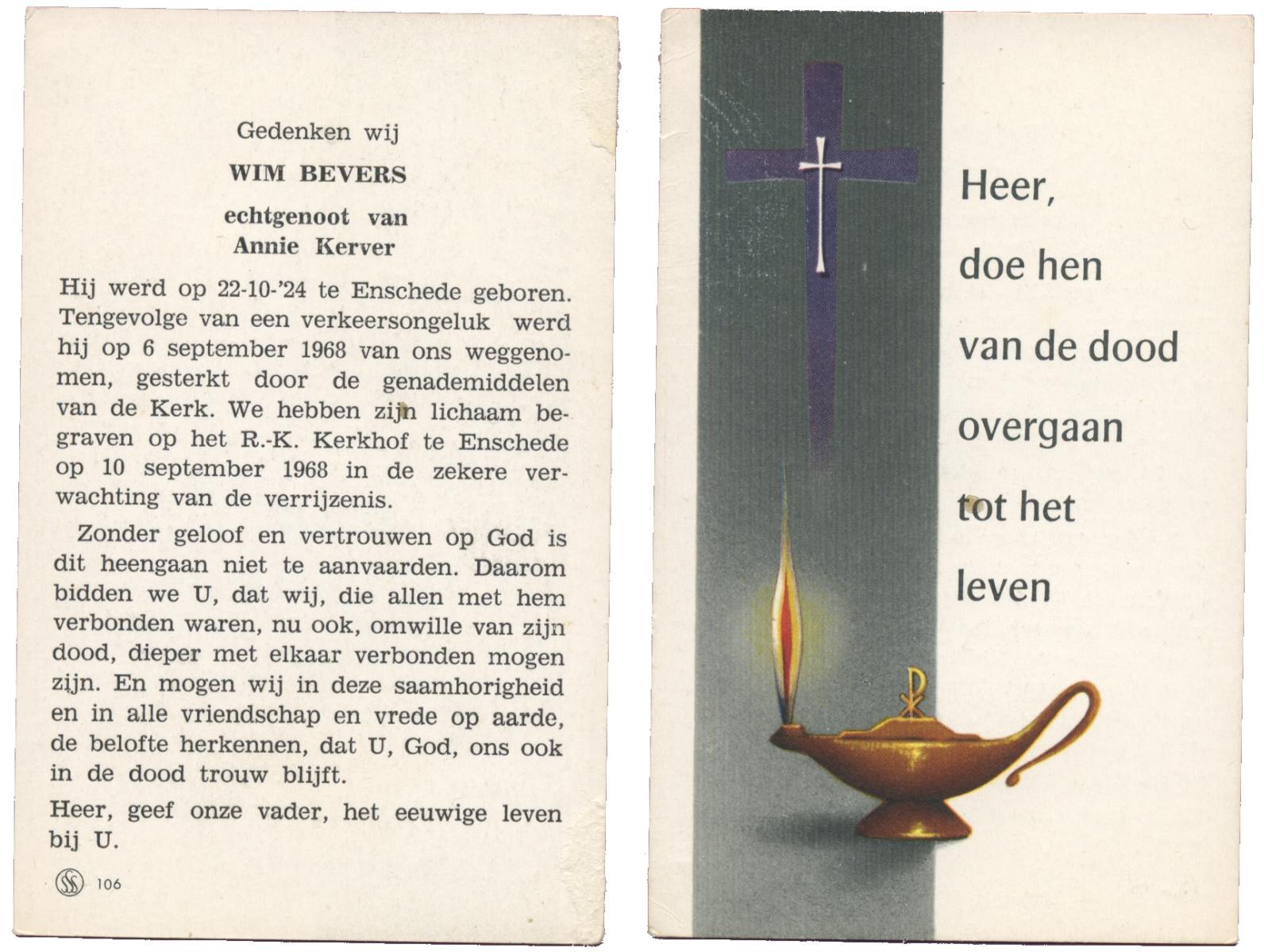BEVERS, Wim, geboren op 22-10-1924 te Enschede, overleden op 6-9-1968 te Enschede op 43-jarige leeftijd, begraven op 10-9-1968 te Enschede.