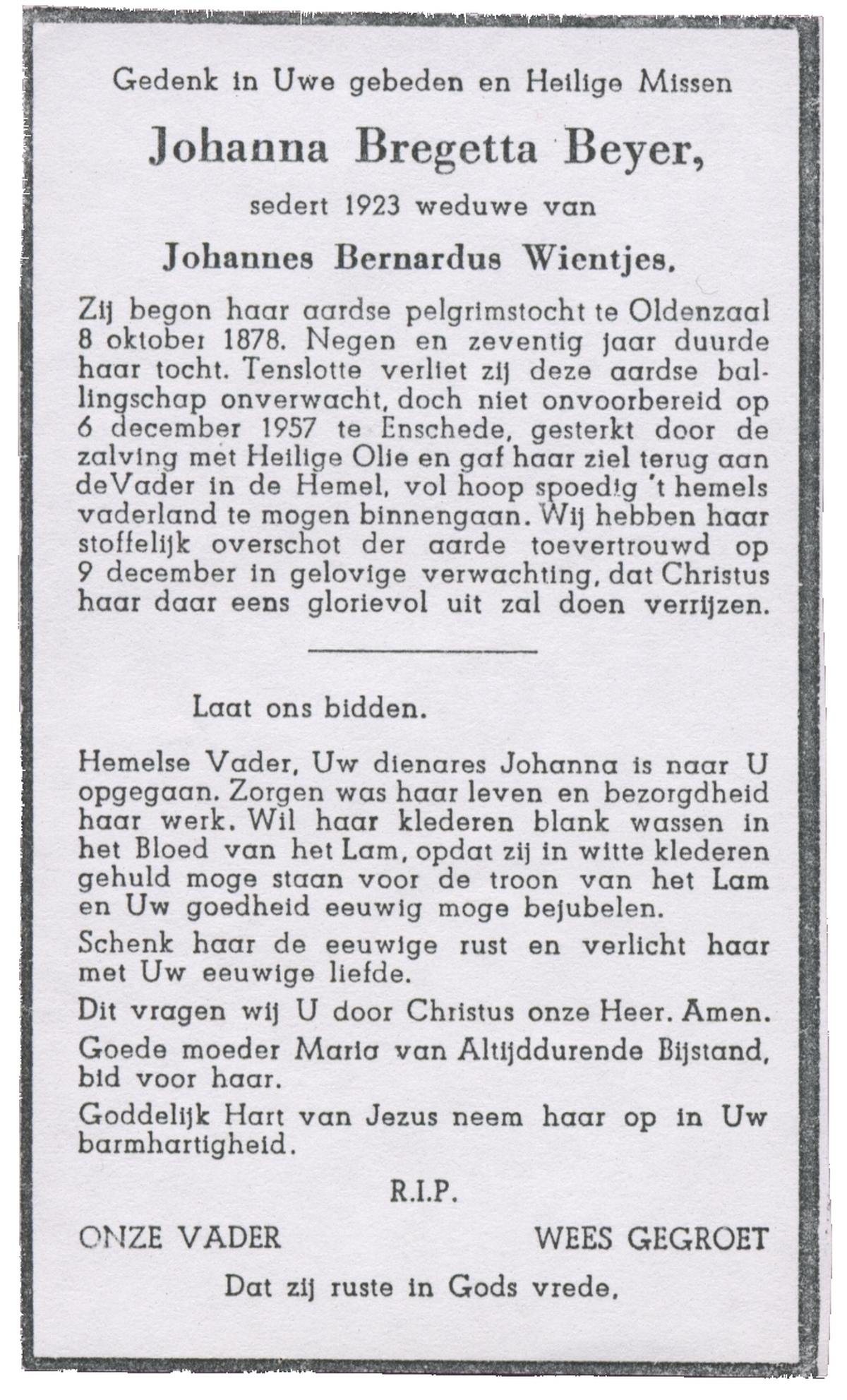 BEYER, Johanna Bregetta, geboren op 08-10-1878 te Oldenzaal, overleden op 6-12-1957 te Enschede op 79-jarige leeftijd, begraven op 9-12-1957.