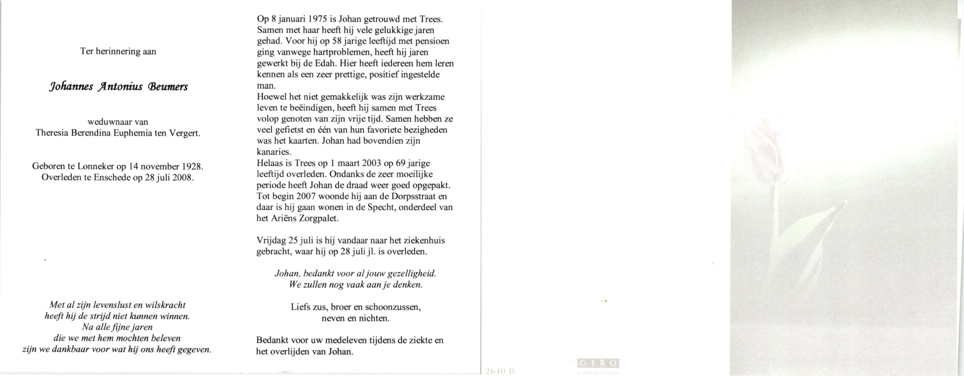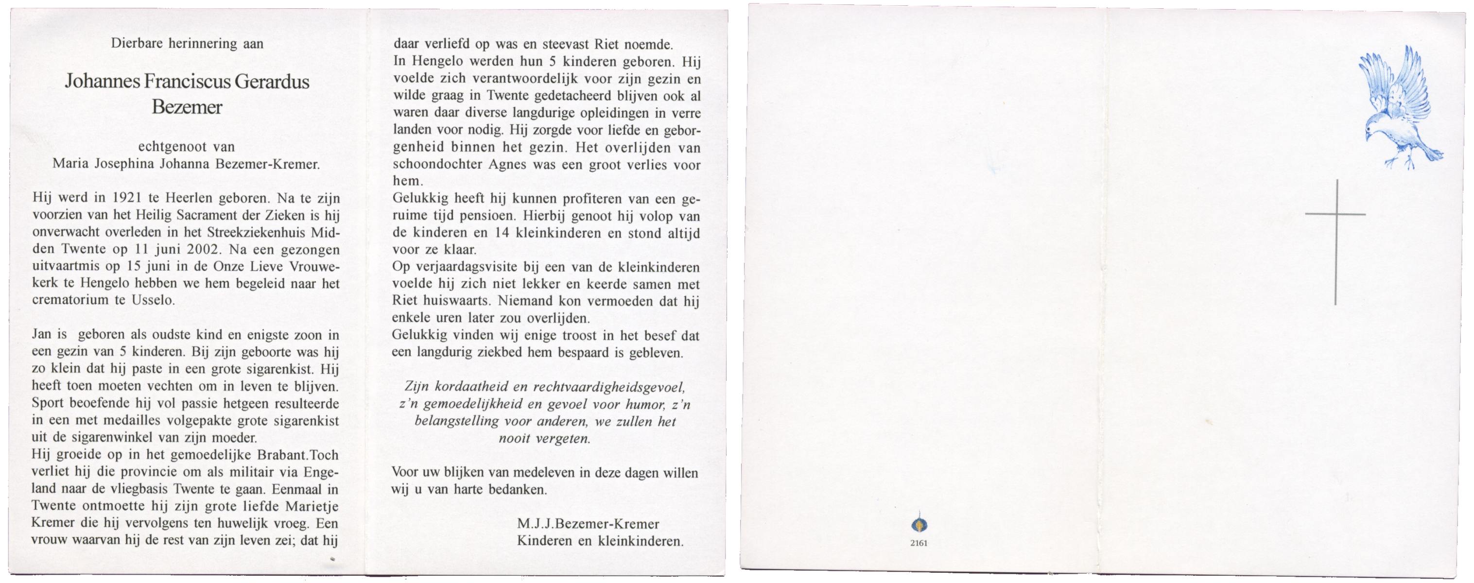 BEZEMER, Johannes Franciskus Gerardus, geboren op 00-00-1921 te Heerlen, overleden op 11-6-2002 te Hengelo (Ov.), gecremeerd op 15-6-2002 te Usselo.