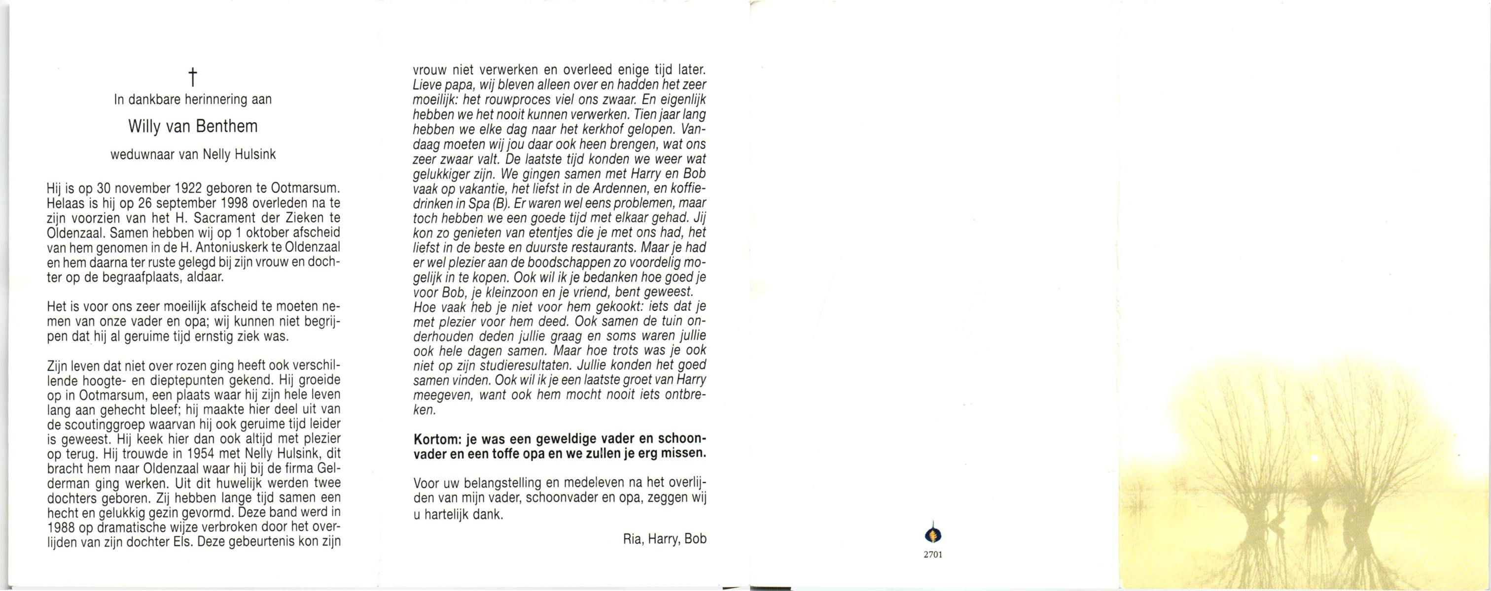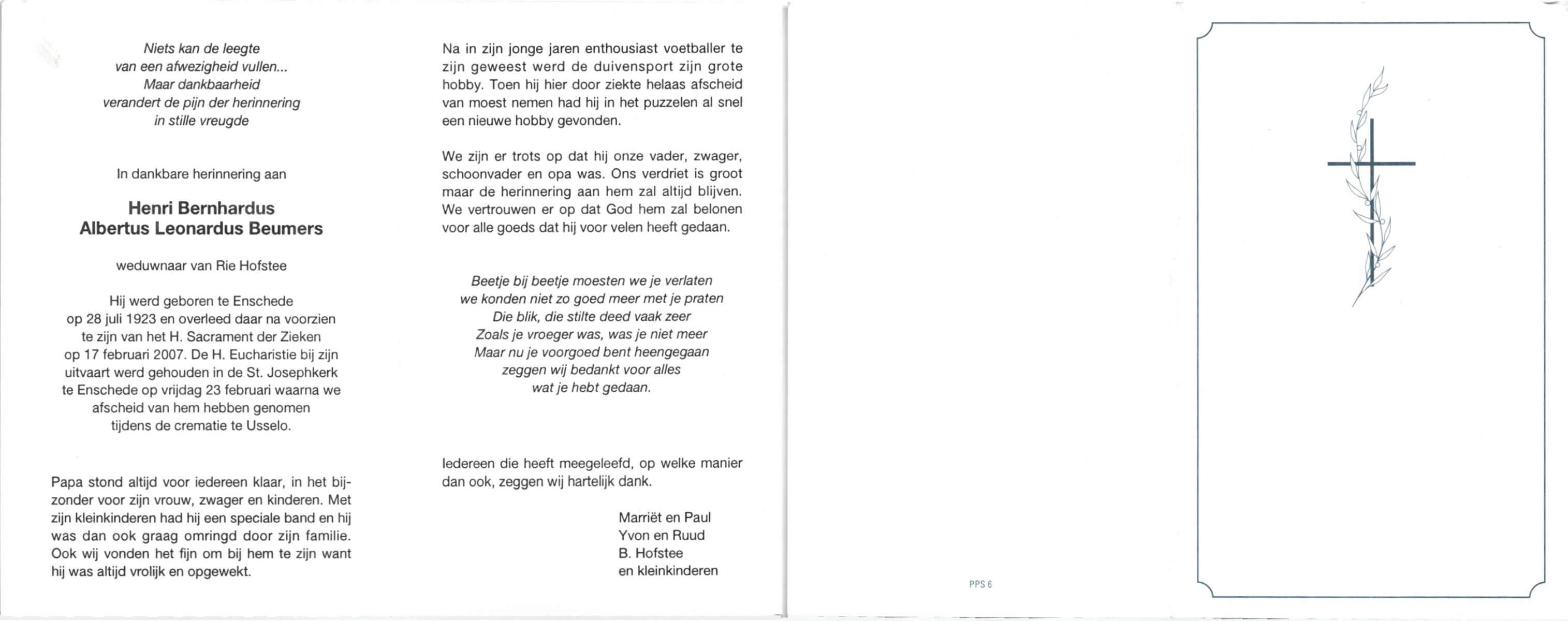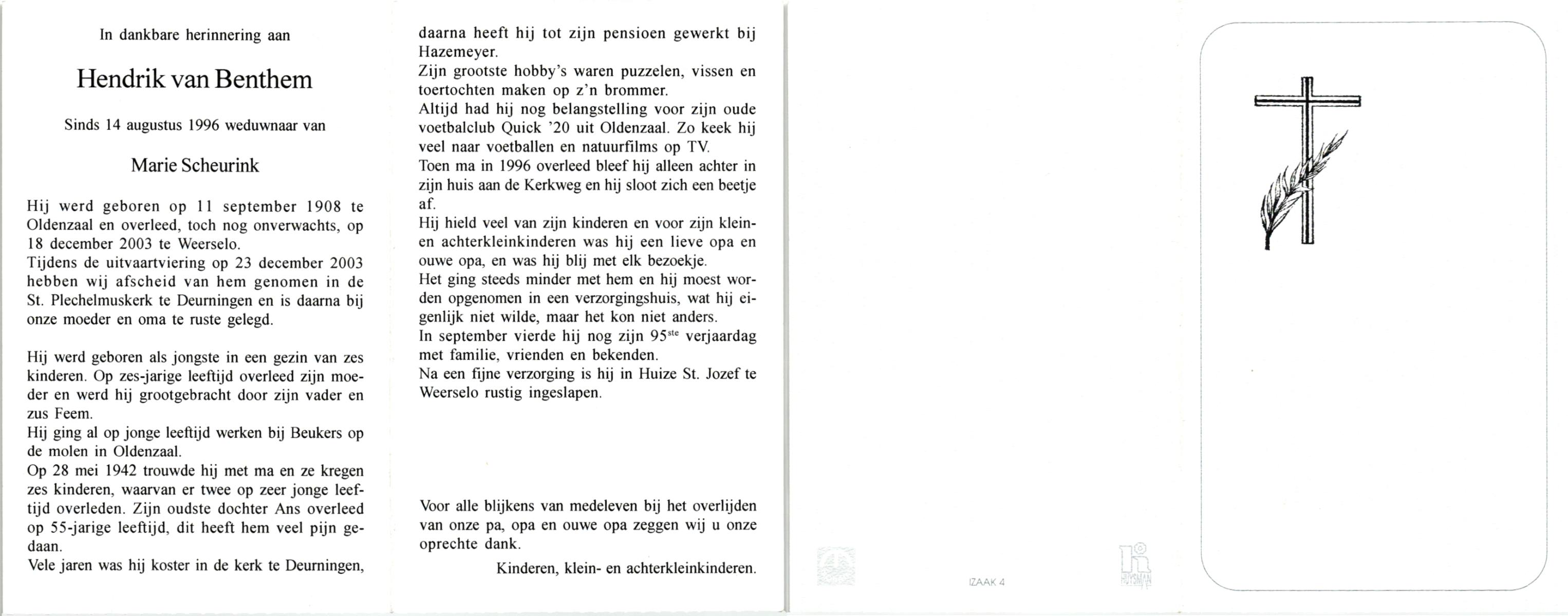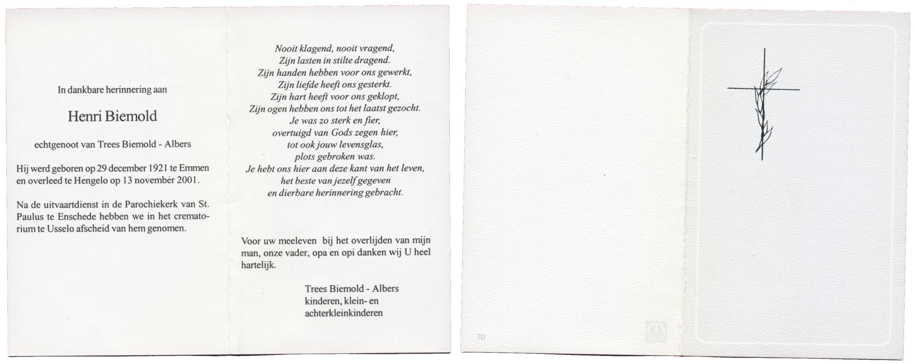 BIEMOLD, Henri, geboren op 29-12-1921 te Emmen, overleden op 13-11-2001 te Hengelo (Ov.) op 79-jarige leeftijd, gecremeerd te Usselo.
