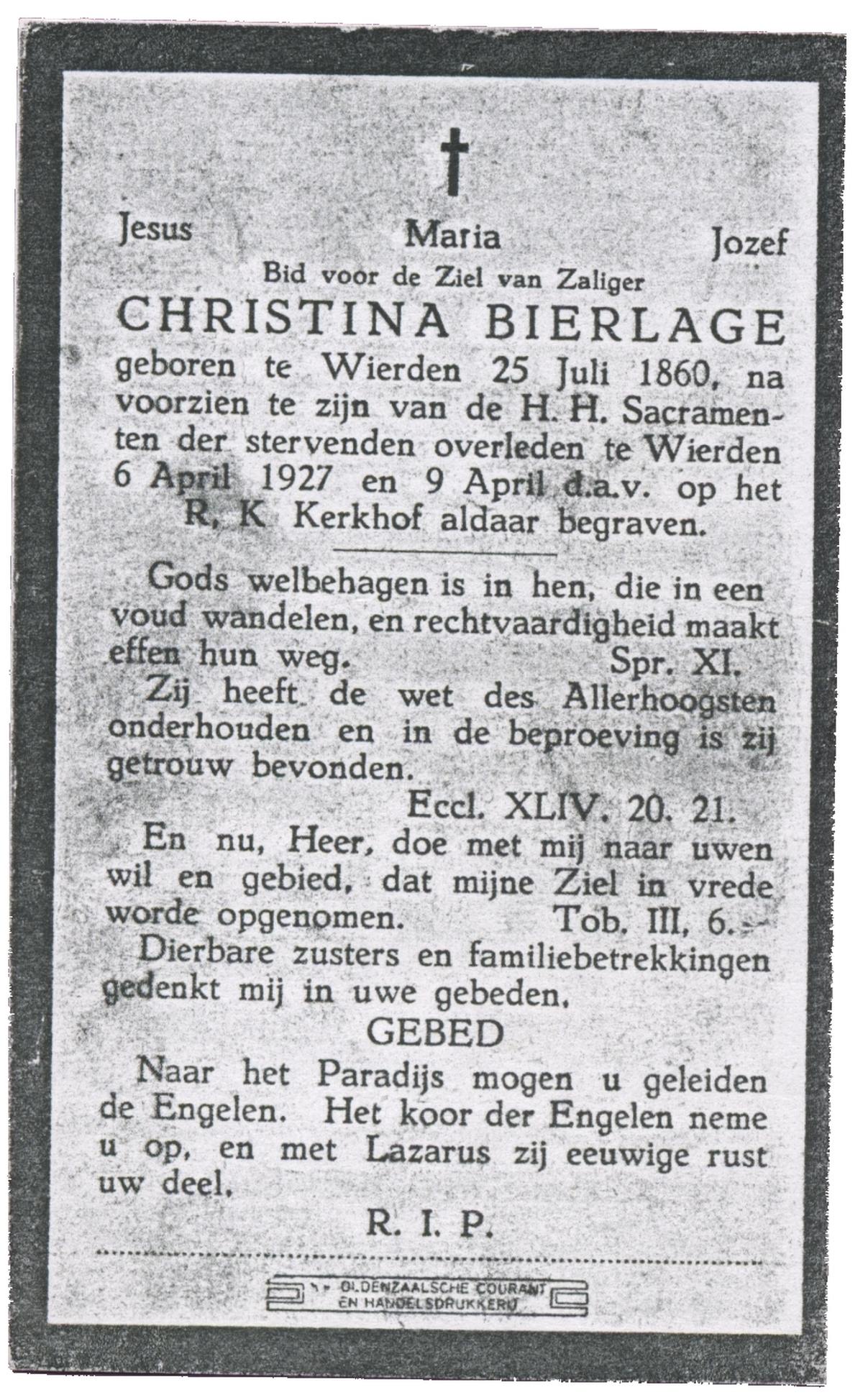 BIERLAGE, Christina, geboren op 25-07-1860 te Wierden, overleden op 6-4-1927 te Wierden op 66-jarige leeftijd, begraven op 9-4-1927 te Wierden.