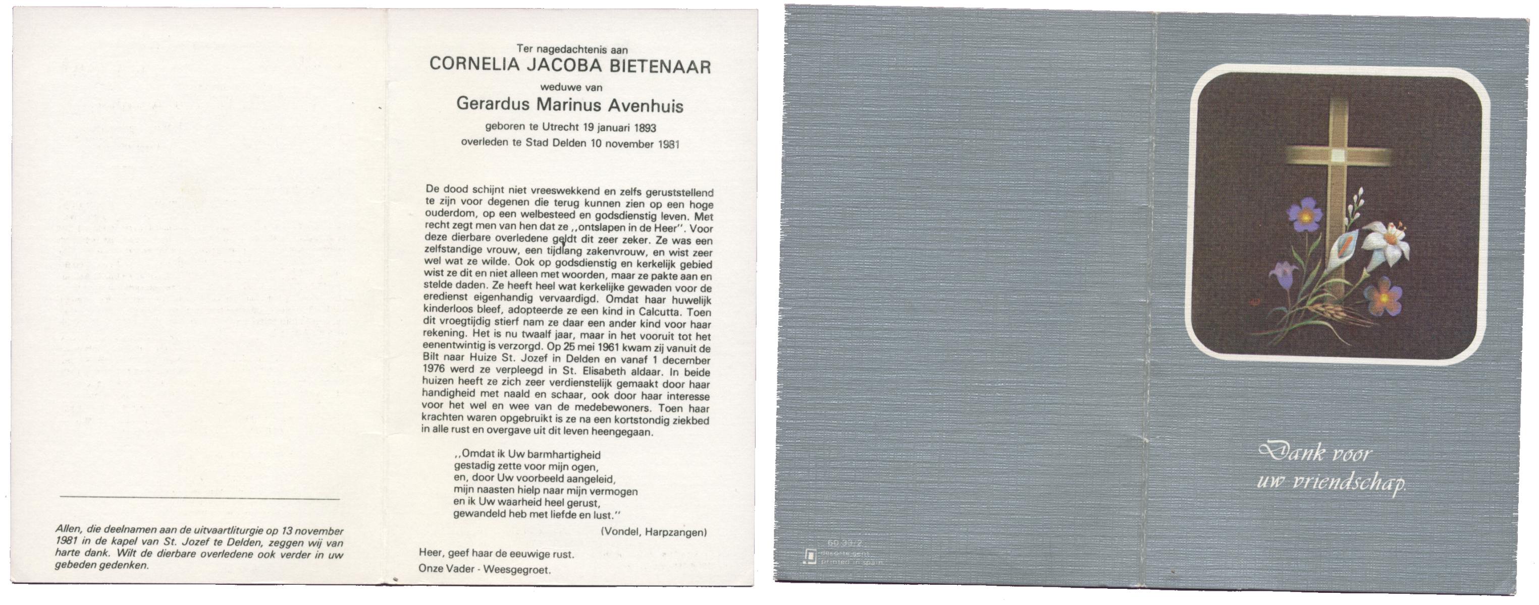 BIETENAAR, Cornelia Jacoba, geboren op 19-01-1893 te Utrecht, overleden op 10-11-1981 te Delden, Stad op 88-jarige leeftijd.