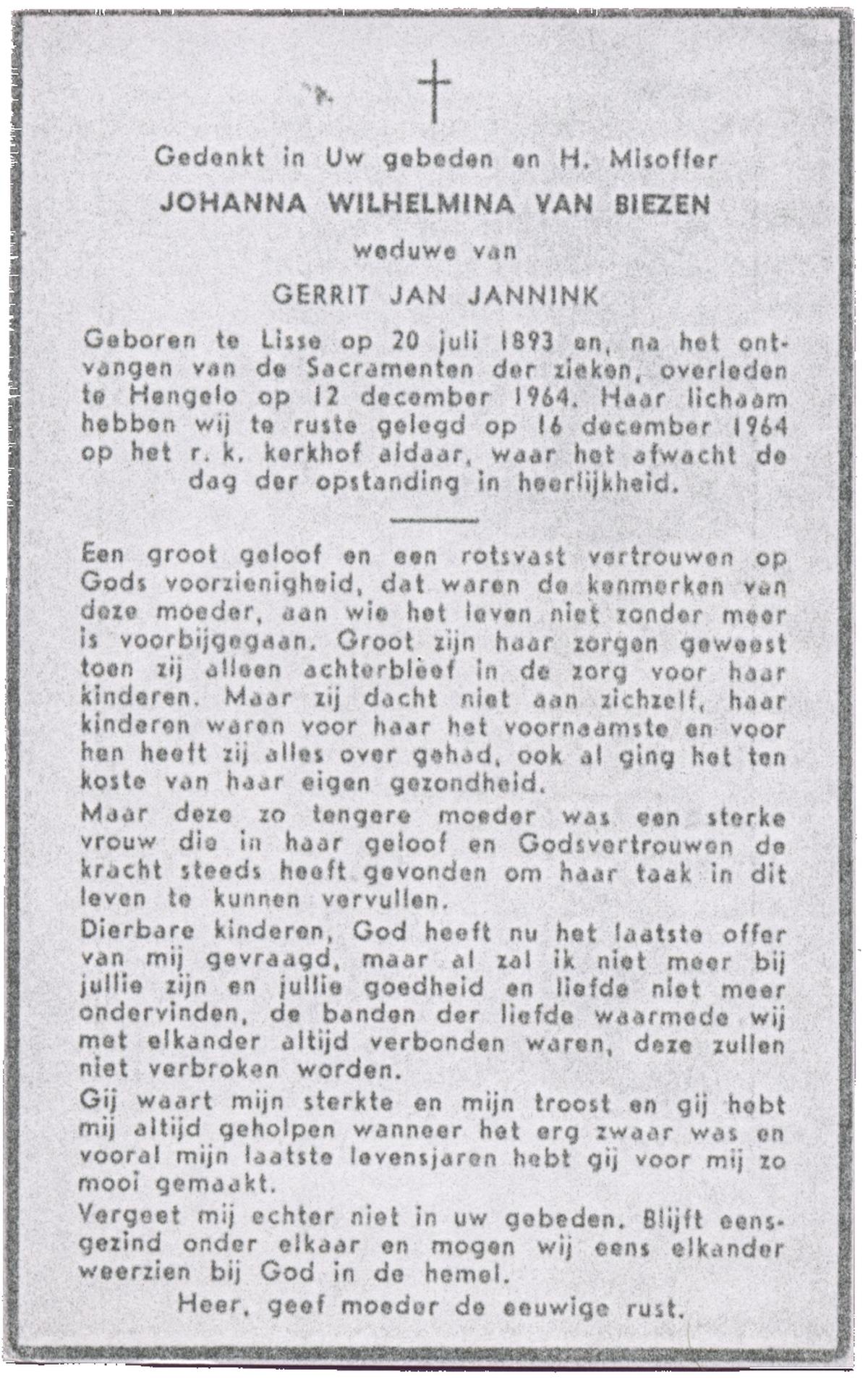 BIEZEN, van, Johanna Wilhelmina, geboren op 20-07-1893 te Lisse, overleden op 12-12-1964 te Hengelo (Ov.) op 71-jarige leeftijd, begraven op 16-12-1964 te Hengelo (Ov.).