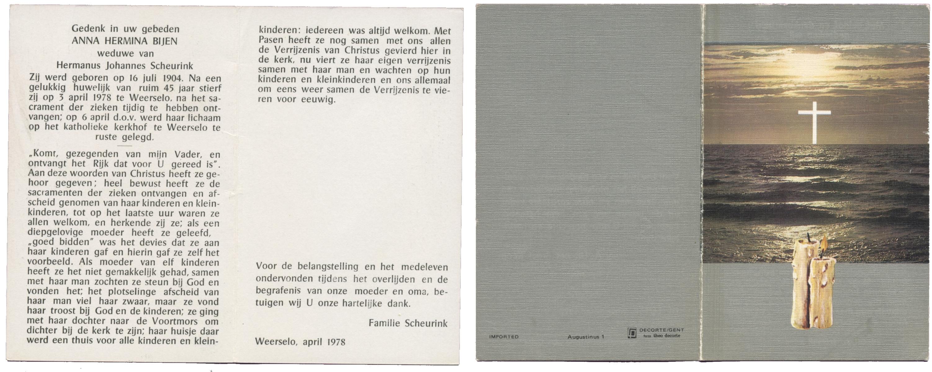 BIJEN, Anna Hermina, geboren op 16-7-1904, overleden op 3-4-1978 te Weerselo op 73-jarige leeftijd, begraven op 6-4-1978 te Weerselo.