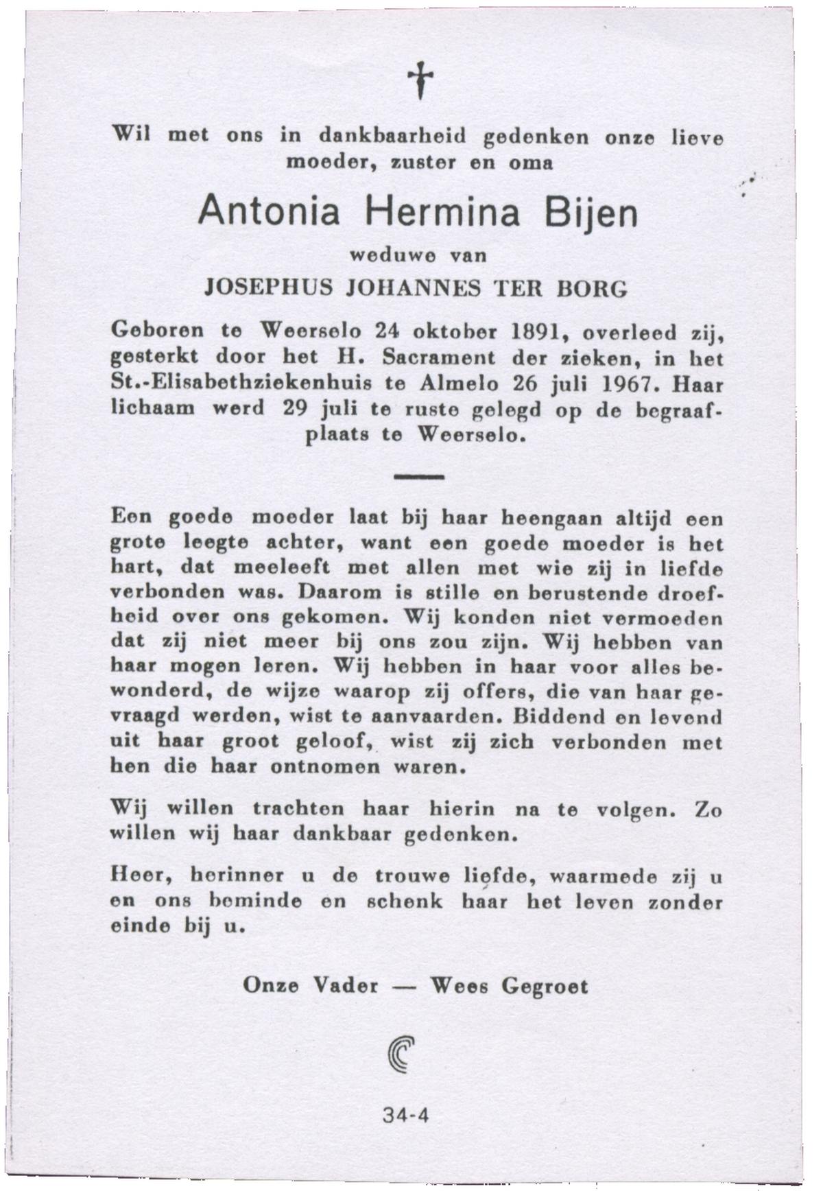 BIJEN, Antonia Hermina, geboren op 24-10-1891 te Weerselo, overleden op 26-7-1967 te Almelo op 75-jarige leeftijd, begraven op 29-7-1967 te Weerselo.