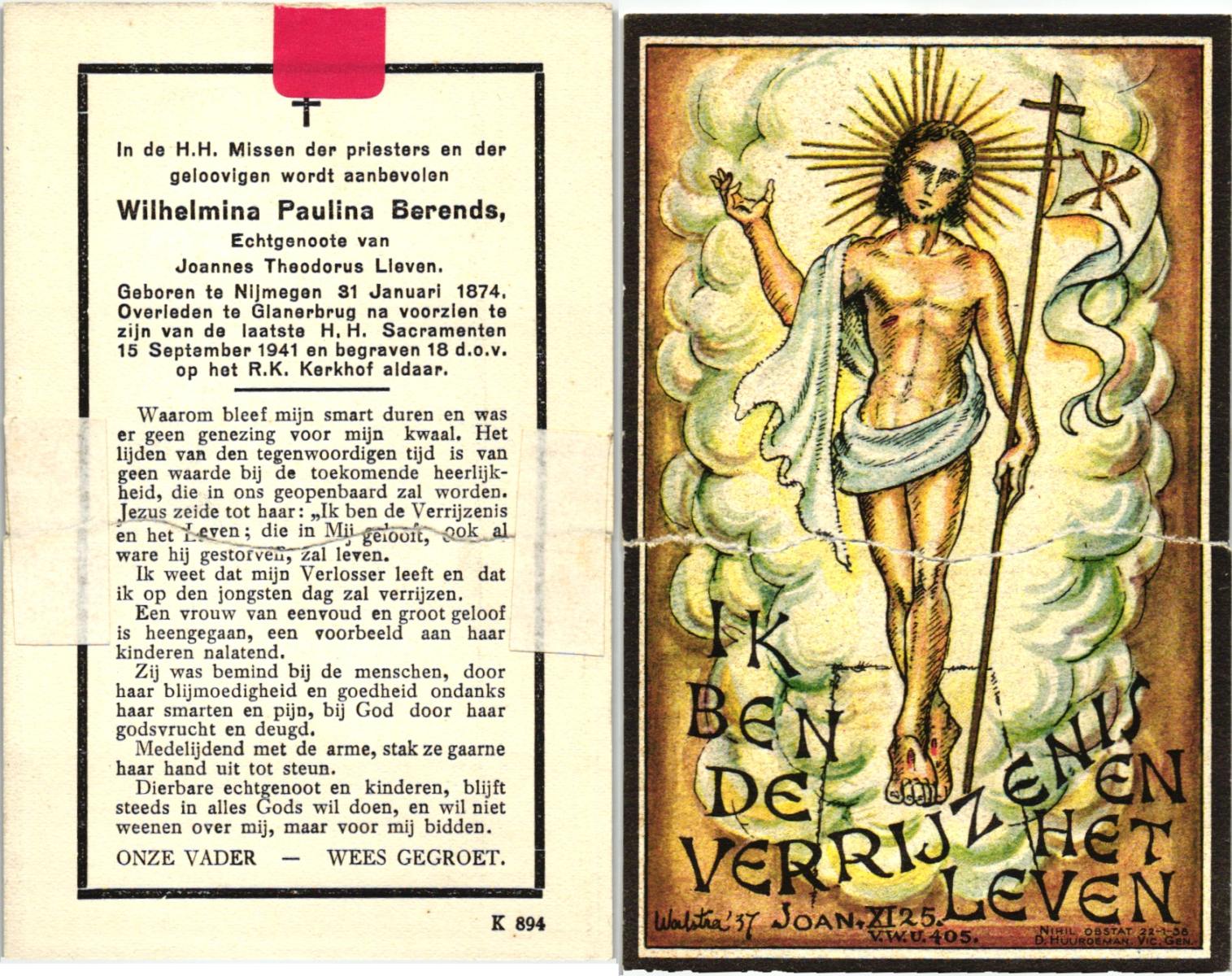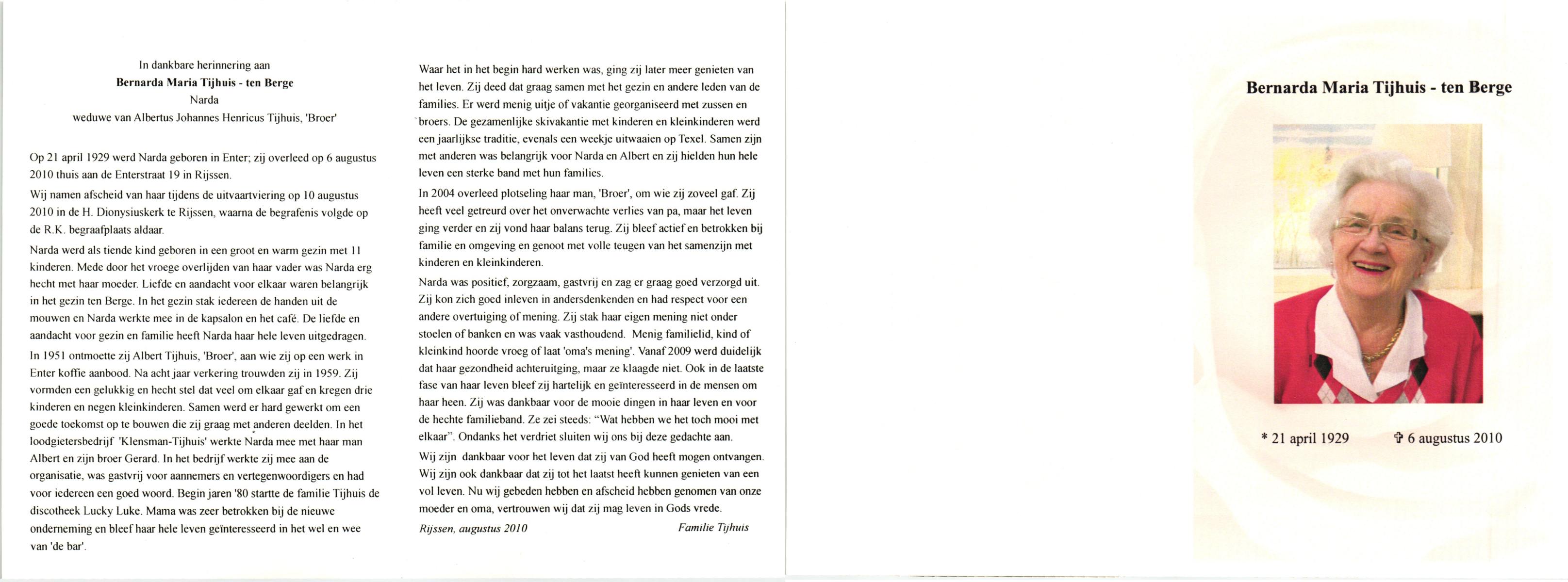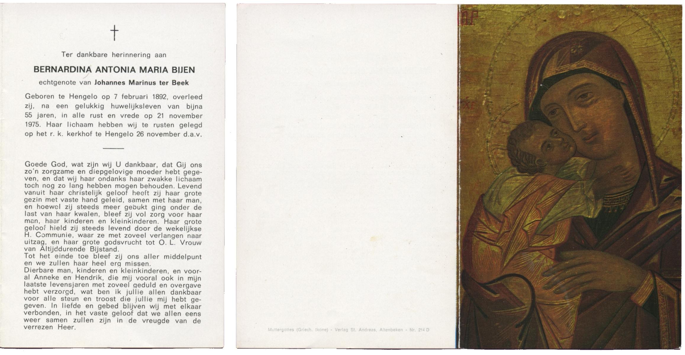 BIJEN, Bernardina Antonia Maria, geboren op 07-02-1892 te Hengelo (O), overleden op 21-11-1975 op 83-jarige leeftijd, begraven op 26-11-1975 te Hengelo (Ov.).