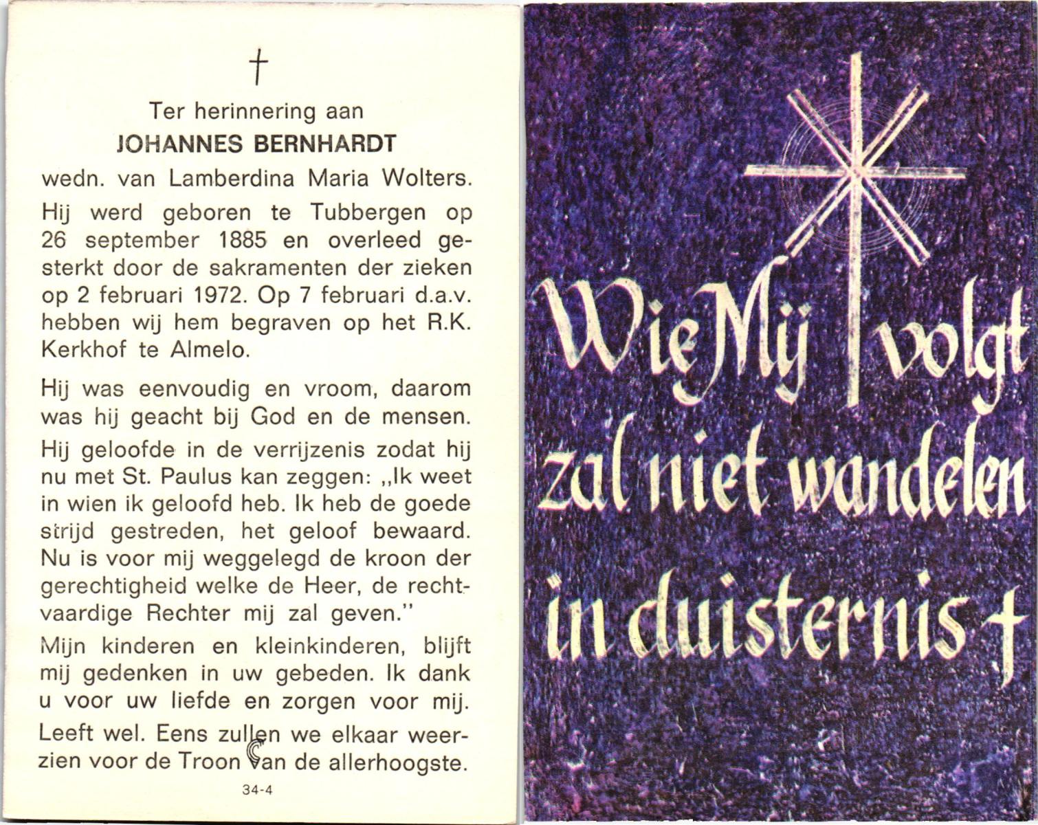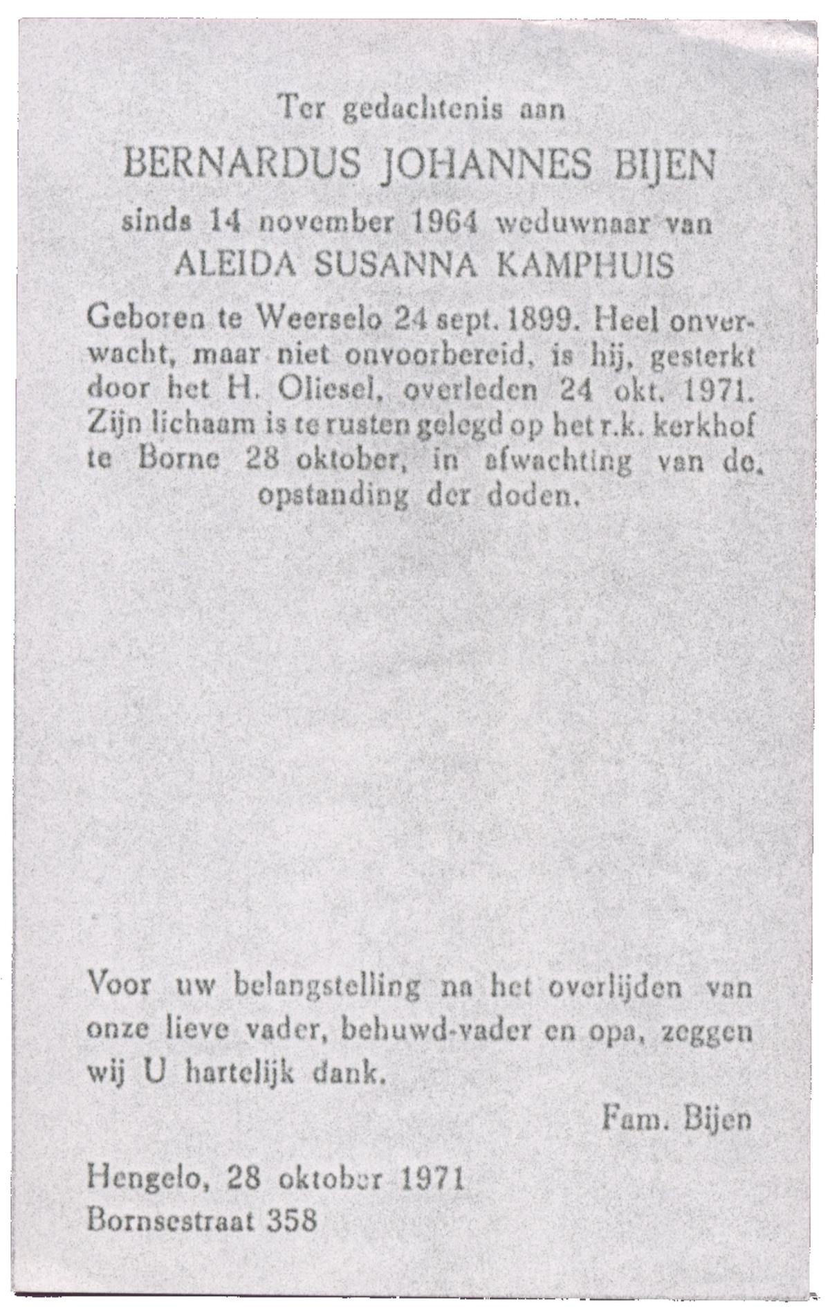 BIJEN, Bernardus Johannes, geboren op 24-09-1899 te Weerselo, overleden op 24-10-1971 op 72-jarige leeftijd, begraven op 28-10-1971 te Borne.