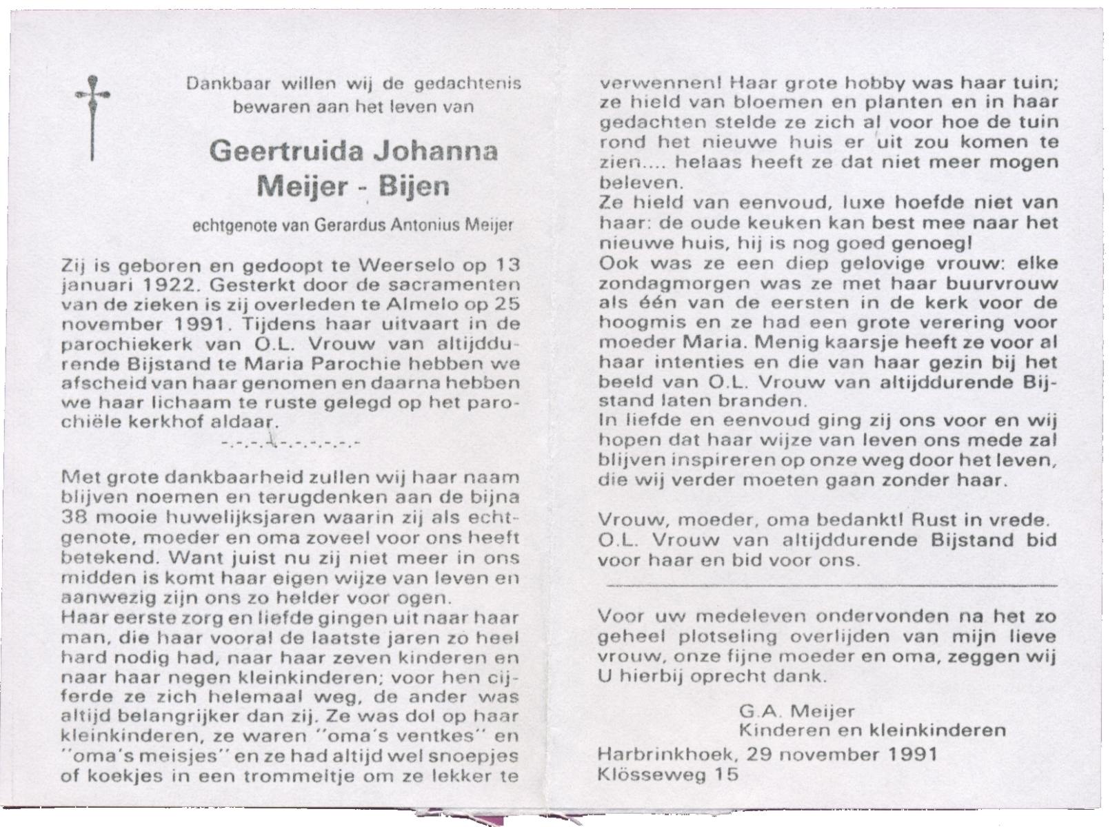BIJEN, Geertruida Johanna, geboren op 13-1-1922 te Weerselo, overleden op 25-11-1991 te Almelo op 69-jarige leeftijd, begraven te Mariaparochie.