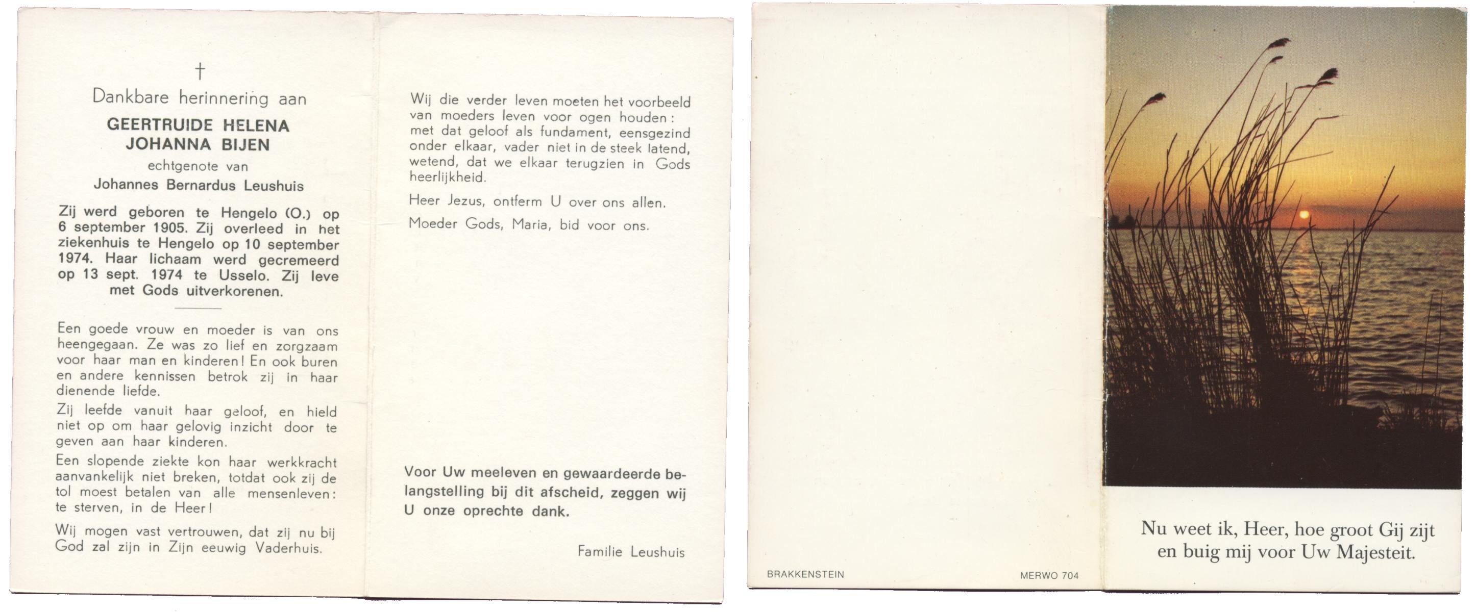 BIJEN, Geertruide Helena Johanna, geboren op 6-9-1905 te Hengelo (O), overleden op 10-9-1974 te Hengelo (Ov.) op 69-jarige leeftijd, gecremeerd op 13-9-1974 te Usselo.