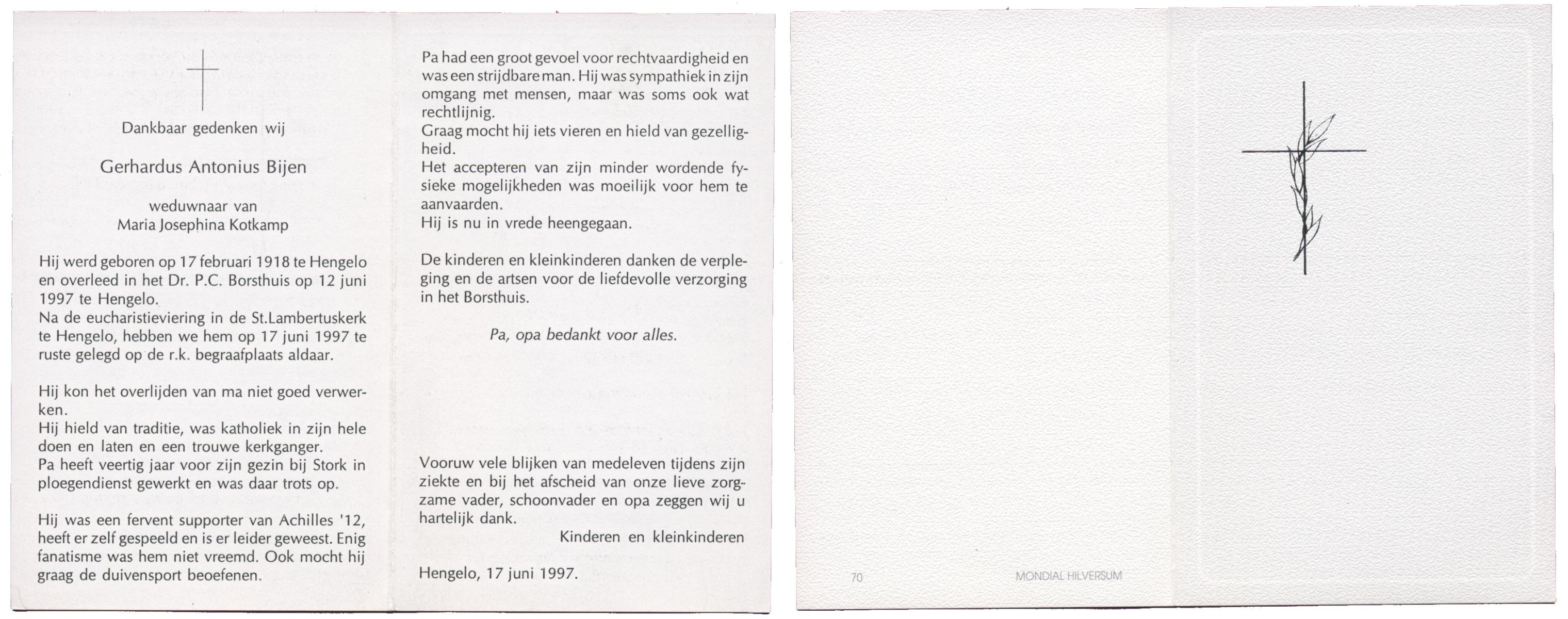 BIJEN, Gerhardus Antonius, geboren op 17-2-1918 te Hengelo (O), overleden op 12-6-1997 te Hengelo (Ov.) op 79-jarige leeftijd, begraven op 17-6-1997 te Hengelo (Ov.).