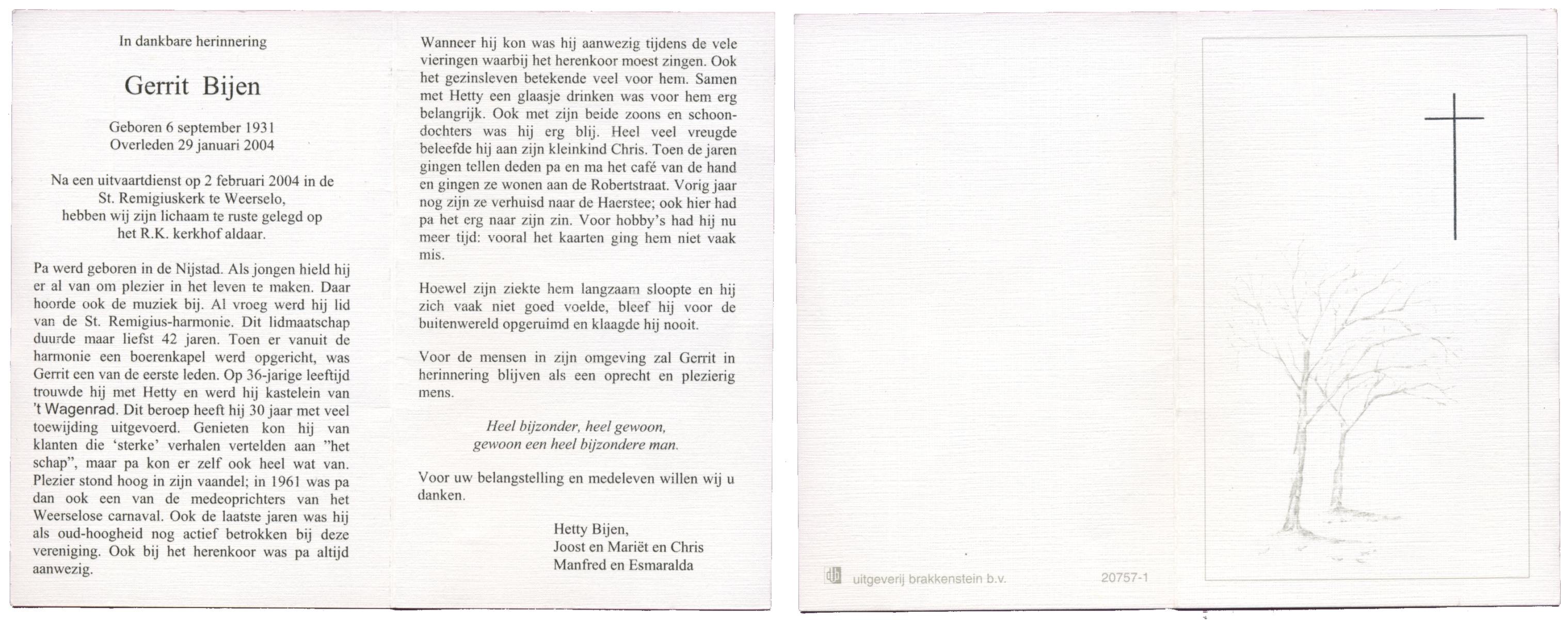 BIJEN, Gerrit, geboren op 6-9-1931, overleden op 29-1-2004 op 72-jarige leeftijd, begraven op 2-2-2004 te Weerselo.