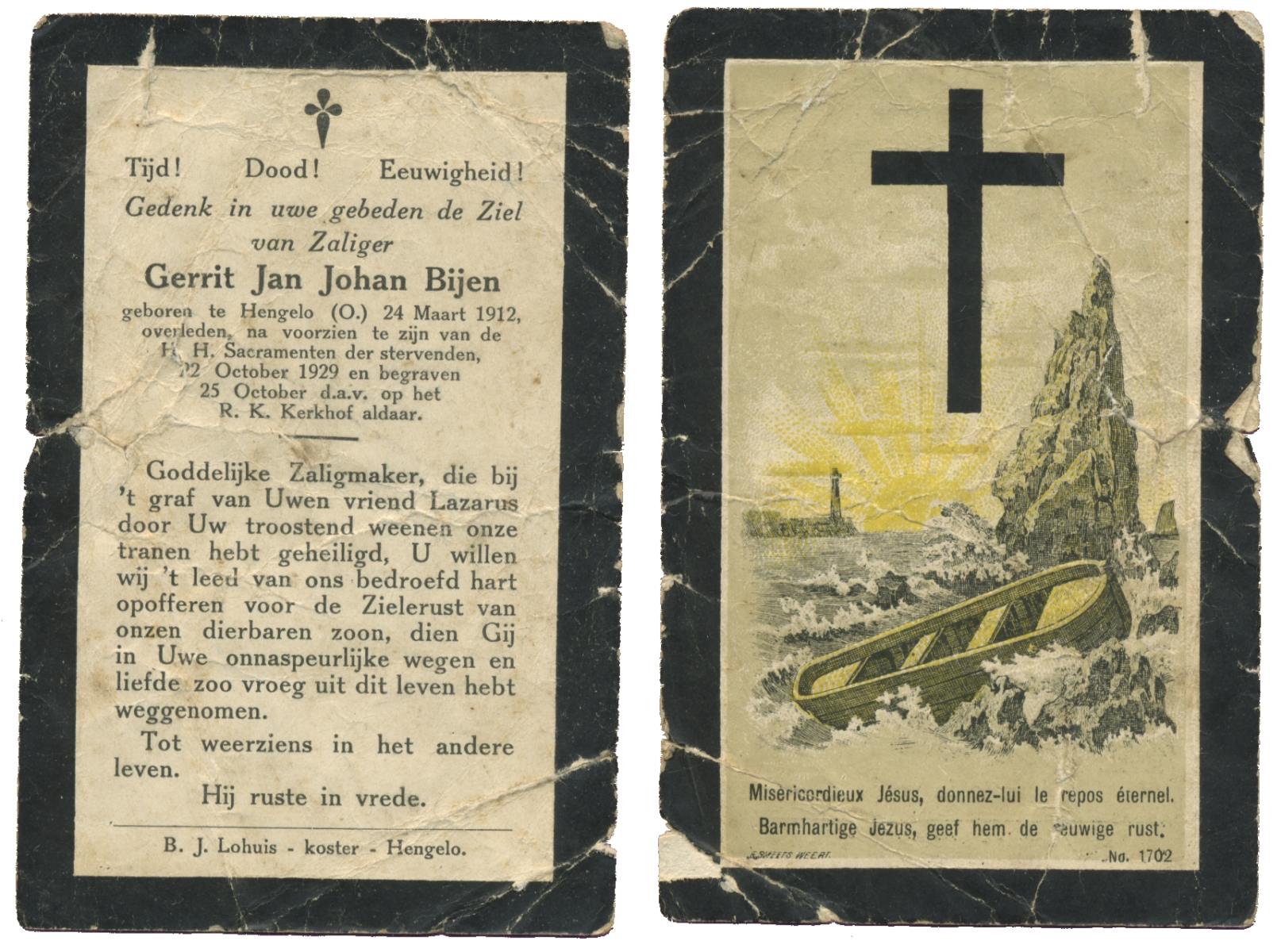 BIJEN, Gerrit Jan Johan, geboren op 24-3-1912 te Hengelo (O), overleden op 22-10-1929 op 17-jarige leeftijd, begraven op 25-10-1929.