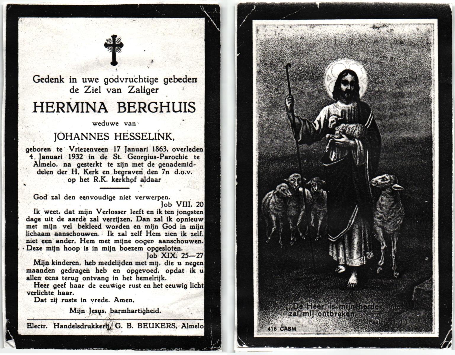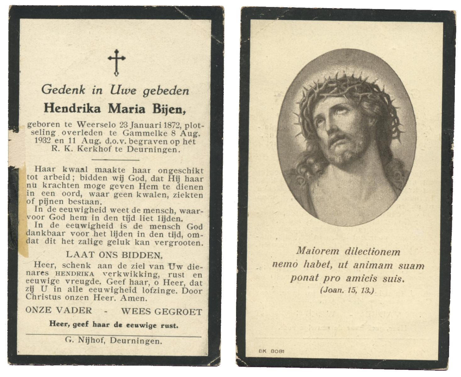 BIJEN, Hendrika Maria, geboren op 23-01-1872 te Weerselo, overleden op 8-8-1932 te Gammelke op 60-jarige leeftijd, begraven op 11-8-1932 te Deurningen.