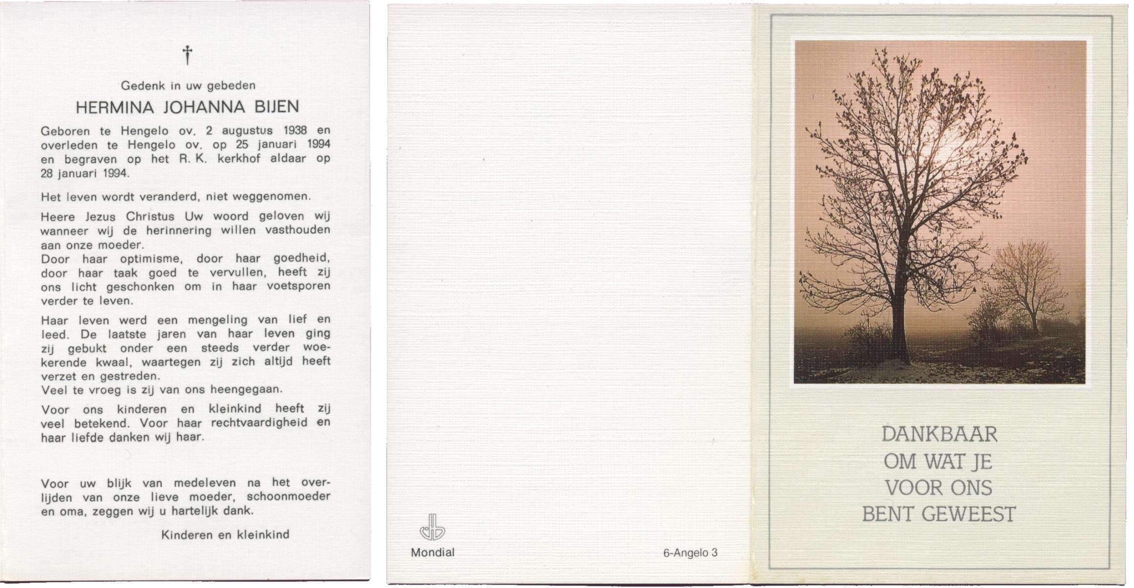 BIJEN, Hermina Johanna, geboren op 2-8-1938 te Hengelo (O), overleden op 25-1-1994 te Hengelo (Ov.) op 55-jarige leeftijd, begraven op 28-1-1994 te Hengelo (Ov.).
