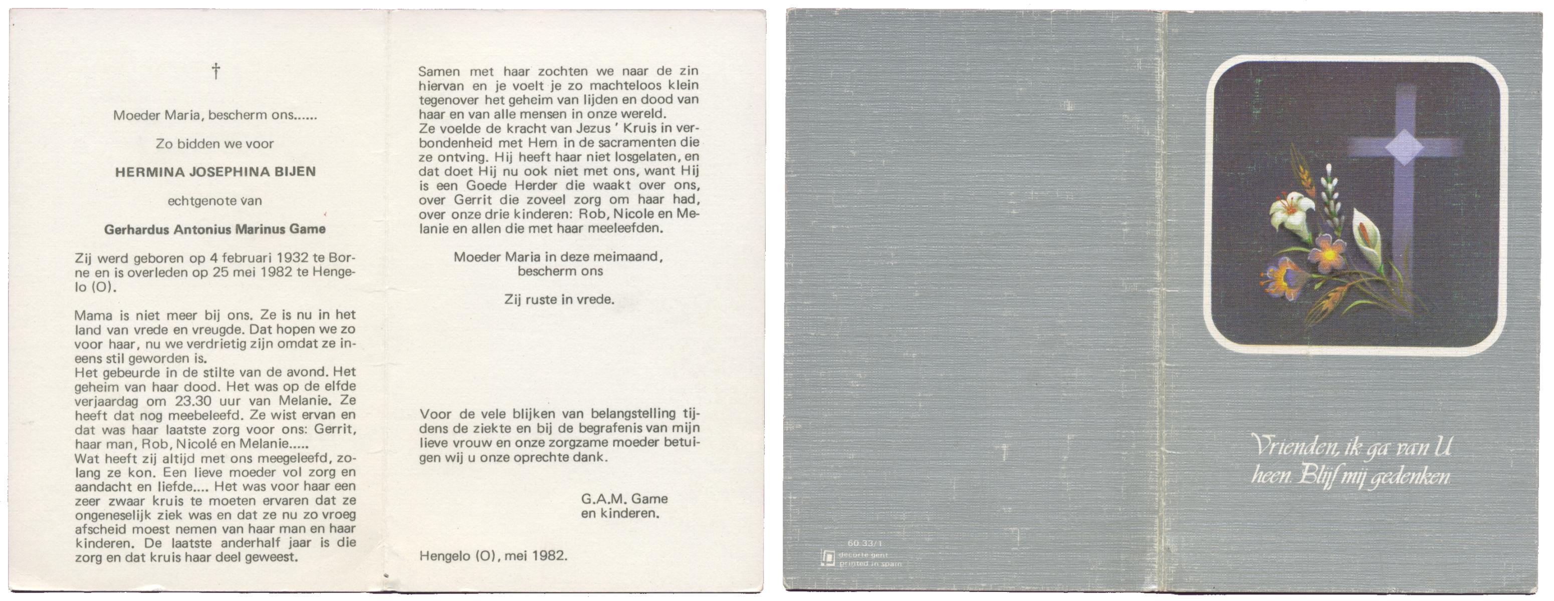 BIJEN, Hermina Josephina, geboren op 4-2-1932 te Borne, overleden op 25-5-1982 te Hengelo (Ov.) op 50-jarige leeftijd.