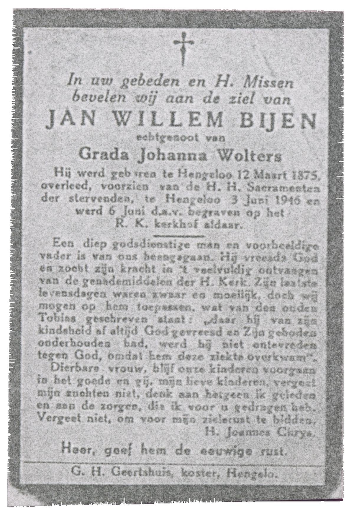 BIJEN, Jan Willem, geboren op 12-03-1875 te Hengelo (O), overleden op 3-6-1946 te Hengelo (Ov.) op 71-jarige leeftijd, begraven op 6-6-1946 te Hengelo (Ov.).