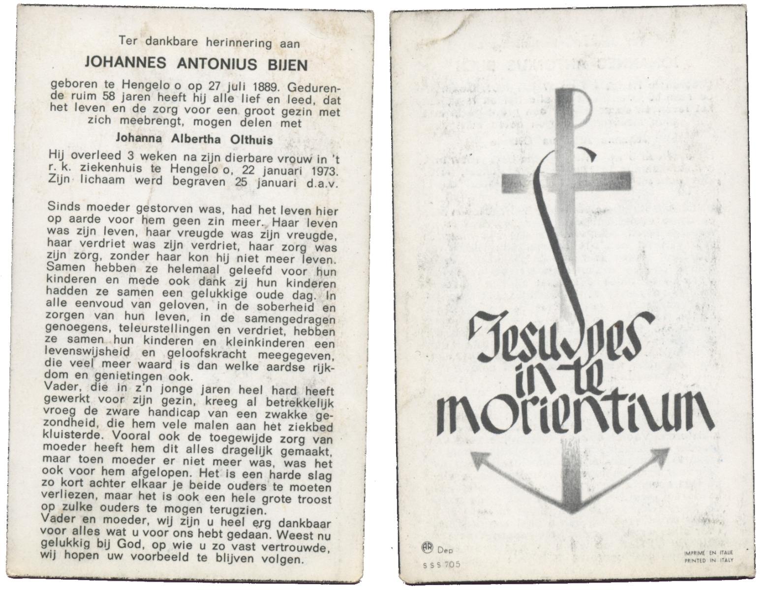 BIJEN, Johannes Antonius, geboren op 27-07-1889 te Hengelo (O), overleden op 22-1-1973 te Hengelo (Ov.) op 83-jarige leeftijd, begraven op 25-1-1973 te Hengelo (Ov.).