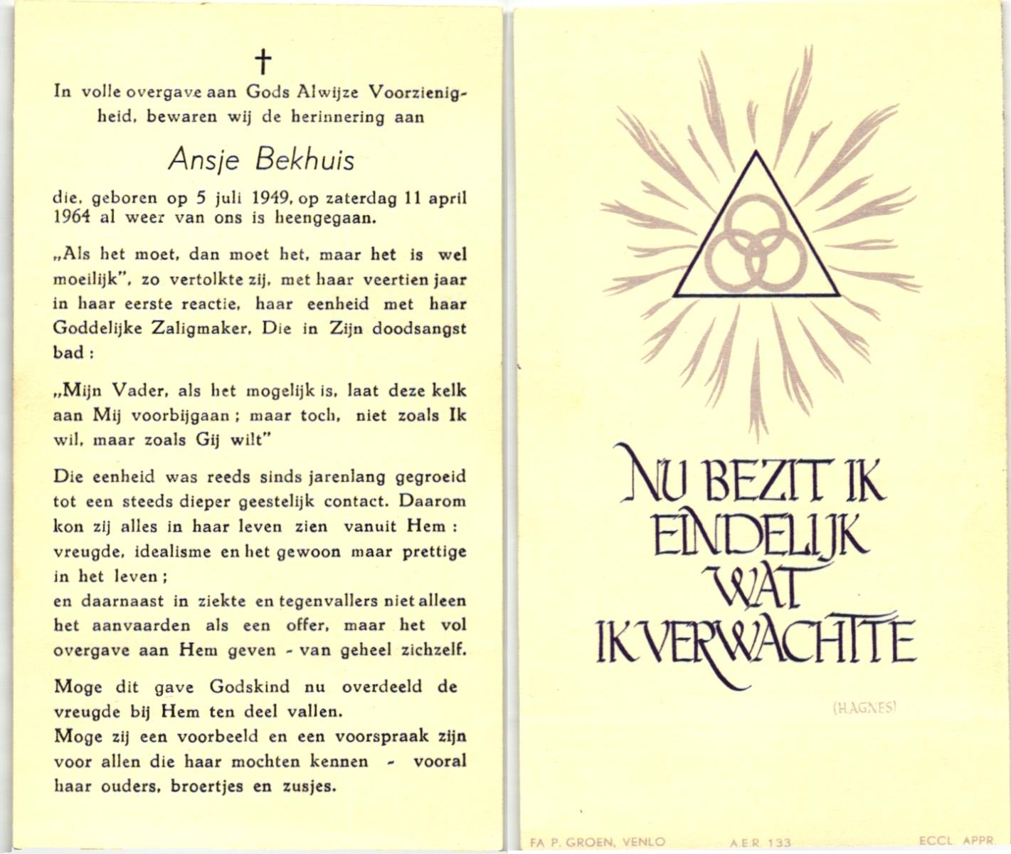 BEKHUIS, , Ansje, geboren op 5-7-1949, overleden op 11-4-1964 op 14-jarige leeftijd.