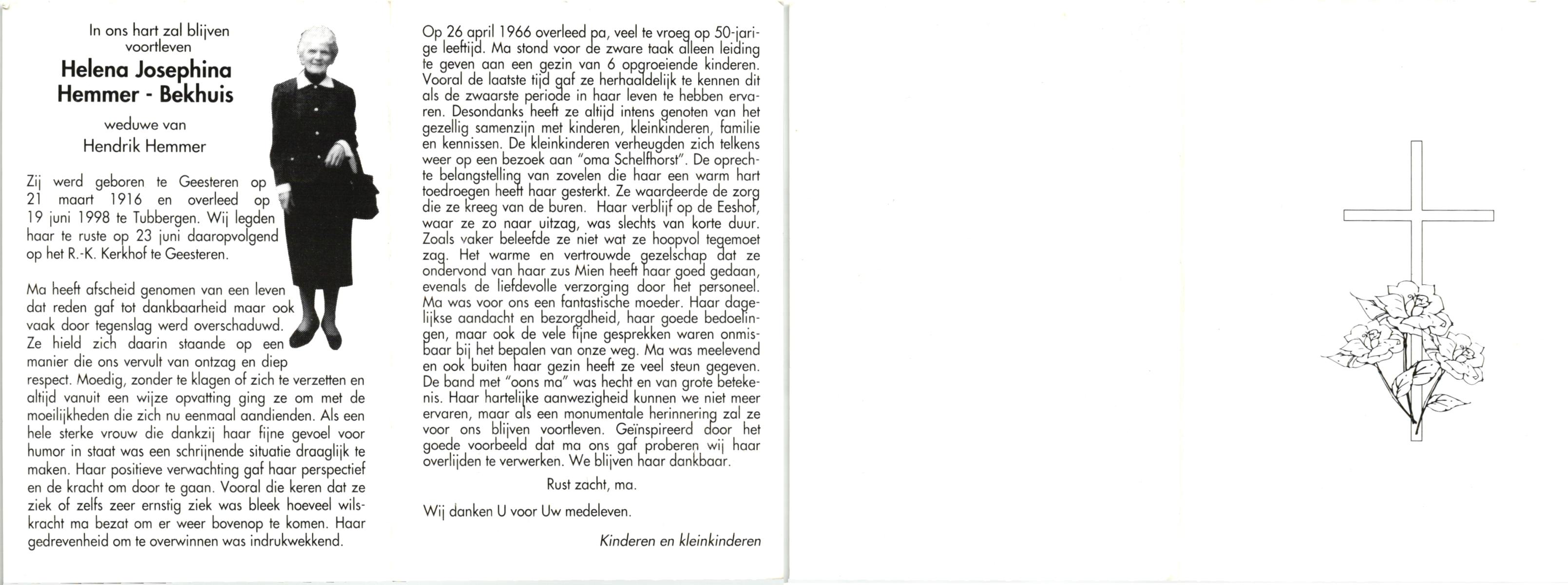 BEKHUIS, , Helena Josephina, geboren op 21-3-1916 te Geesteren, overleden op 19-6-1998 te Tubbergen op 82-jarige leeftijd, begraven op 23-6-1998 te Geesteren.