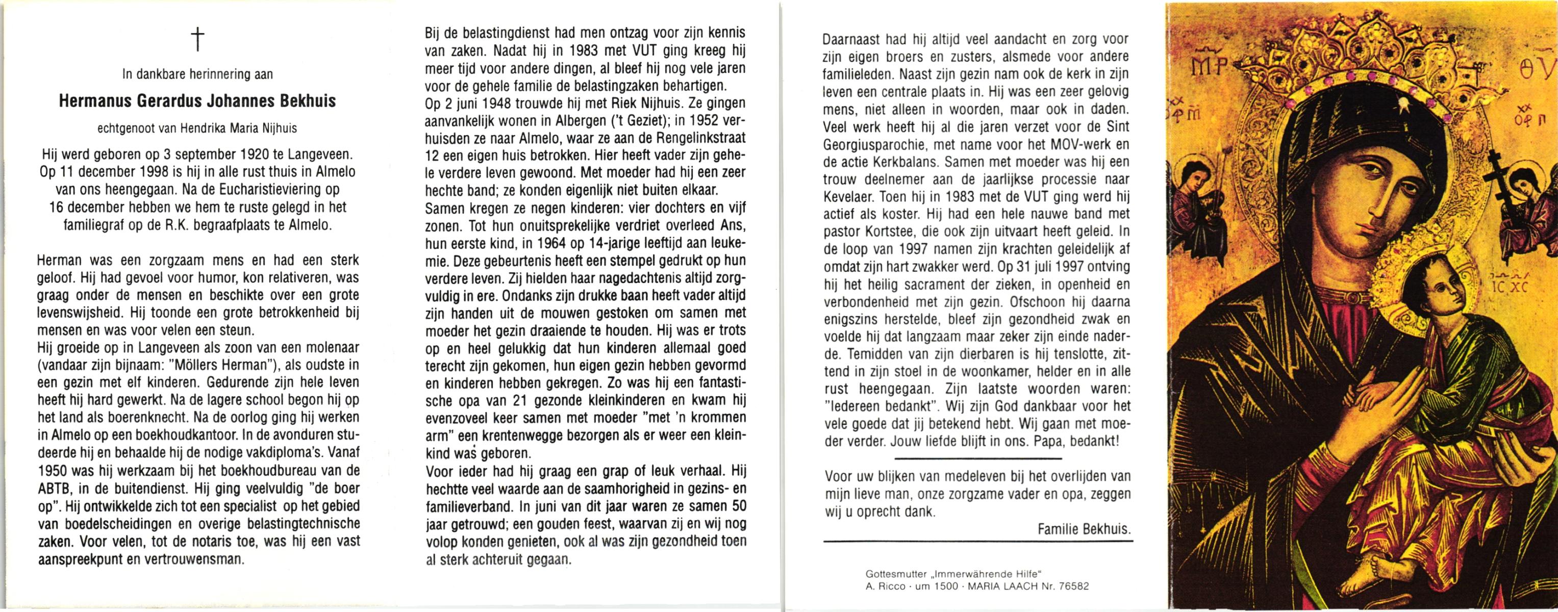 BEKHUIS, , Hermanus Gerardus Johannes, geboren op 3-9-1920 te Langeveen, overleden op 11-12-1998 te Almelo op 78-jarige leeftijd, begraven op 16-12-1998 te Almelo, rk.