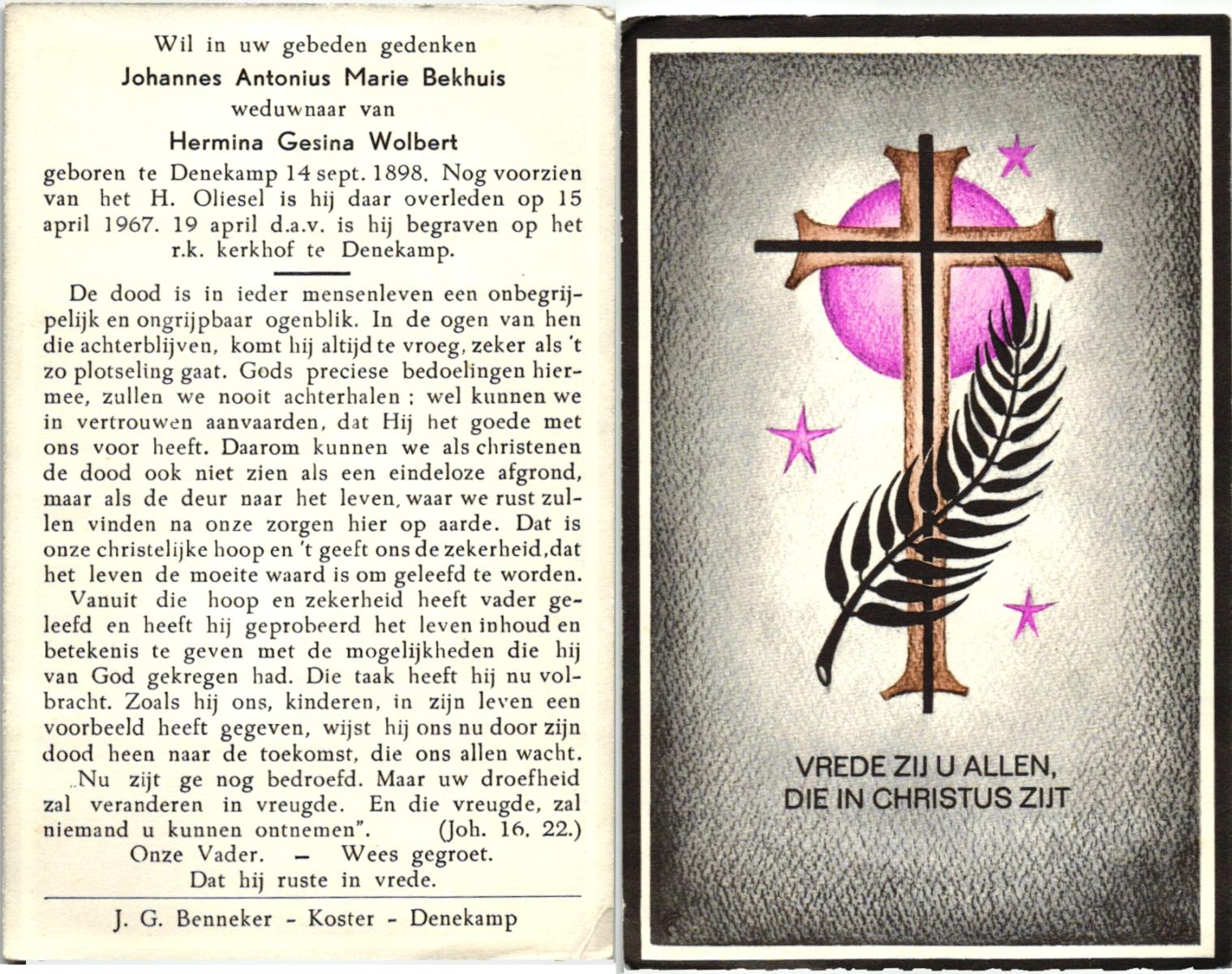 BEKHUIS, , Johannes Antonius Maria, geboren op 14-09-1898 te Denekamp, overleden op 15-4-1967 te Denekamp op 68-jarige leeftijd, begraven op 19-4-1967 te Denekamp.