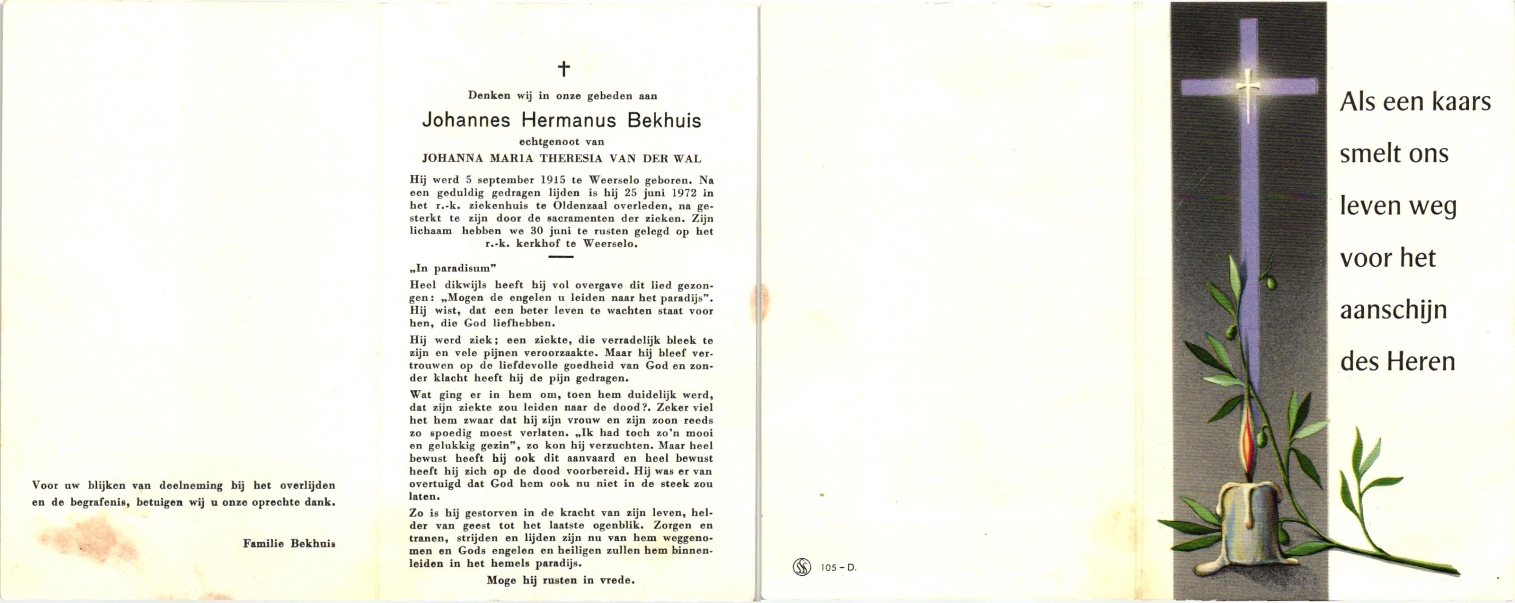 BEKHUIS, , Johannes Hermanus, geboren op 5-9-1915 te Weerselo, overleden op 25-6-1972 te Oldenzaal op 56-jarige leeftijd, begraven op 30-6-1972 te Weerselo.