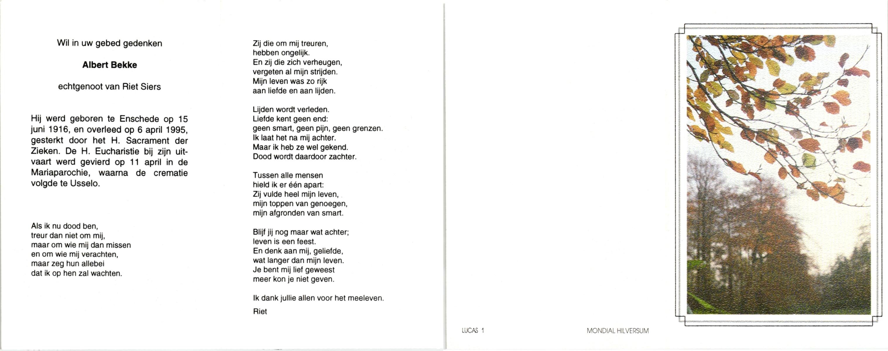 BEKKE, , Albert, geboren op 15-6-1916 te Enschede, overleden op 6-4-1995 op 78-jarige leeftijd, gecremeerd op 11-4-1995 te Usselo.