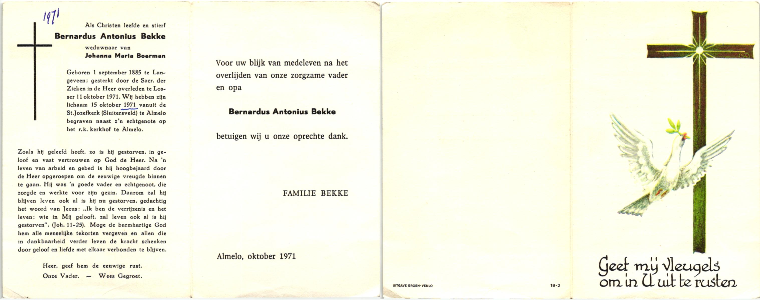 BEKKE, , Bernardus Antonius, geboren op 01-09-1885 te Langeveen, overleden op 11-10-1971 te Losser op 86-jarige leeftijd, begraven op 15-10-1971 te Almel, rk.