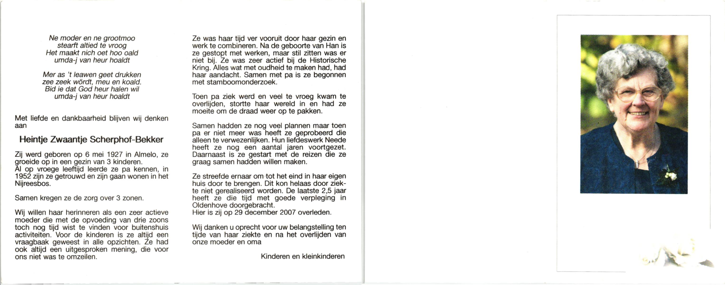 BEKKER, , Heintje Zwaantje, geboren op 6-5-1927 te Almelo, overleden op 29-12-2007 op 80-jarige leeftijd.
