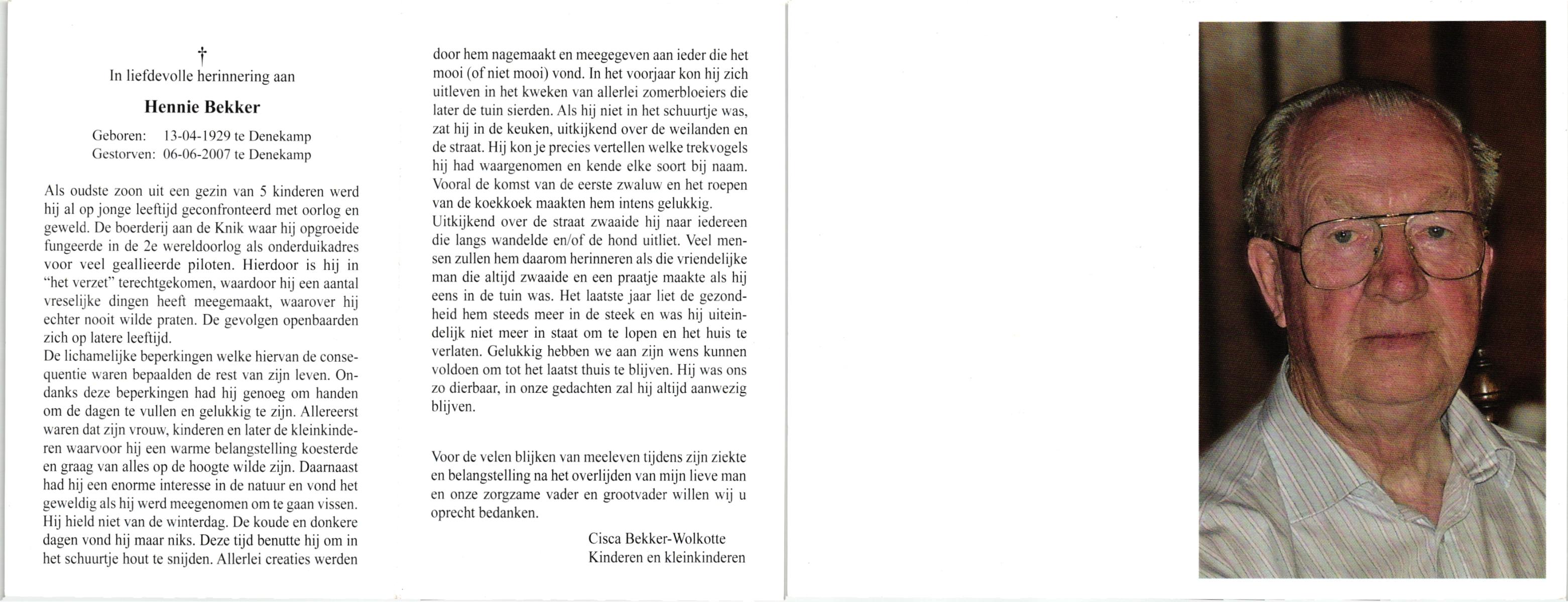 BEKKER, , Hennie, geboren op 13-4-1929 te Denekamp, overleden op 6-6-2006 te Denekamp op 77-jarige leeftijd.