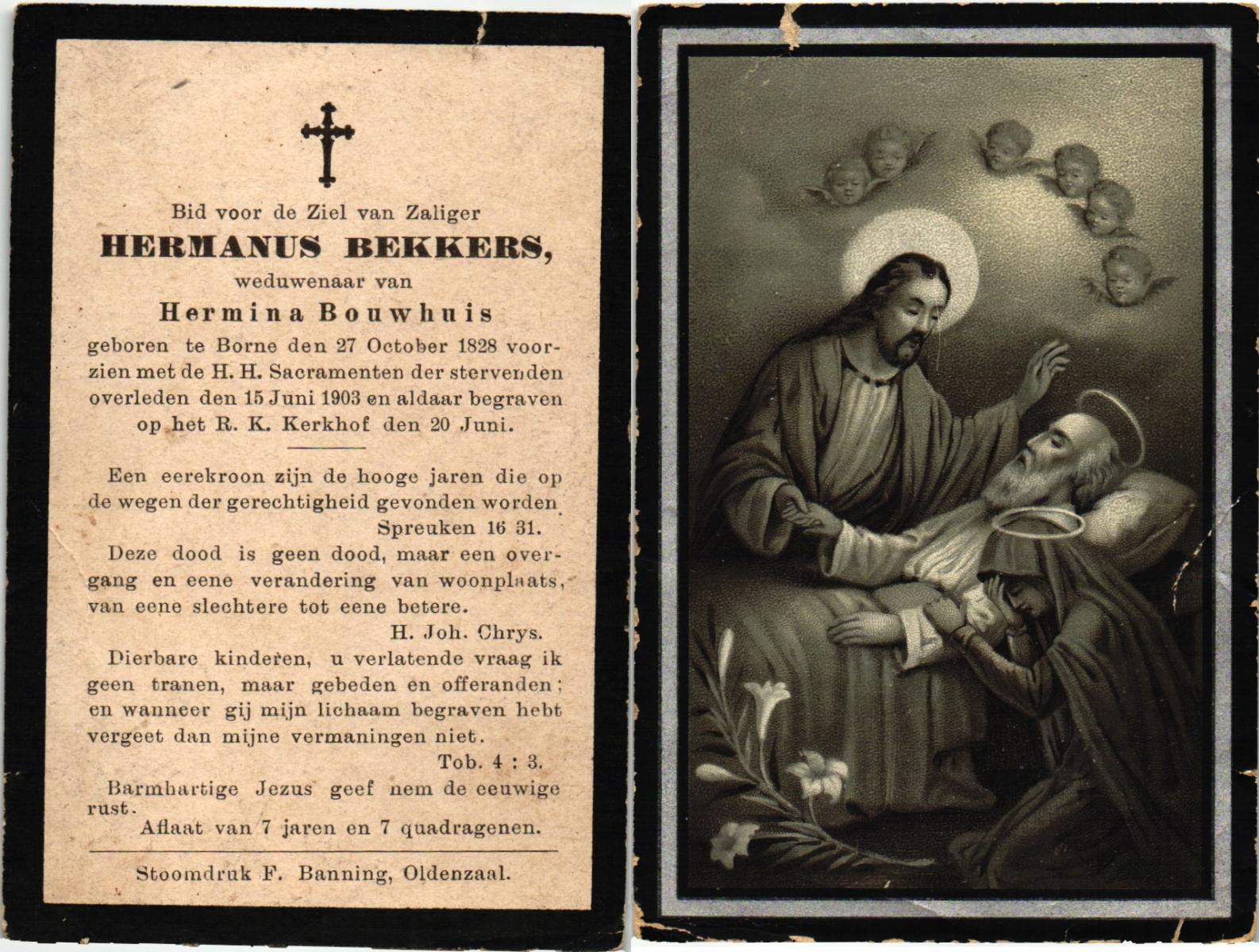 BEKKERS, , Hermanus, geboren op 27-10-1828 te Borne, overleden op 15-6-1903 te Borne op 74-jarige leeftijd, begraven op 20-6-1903 te Borne.