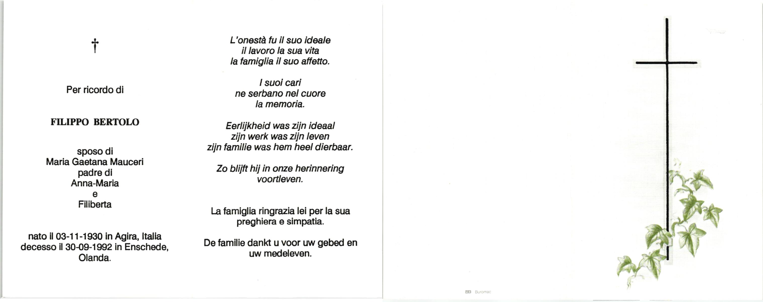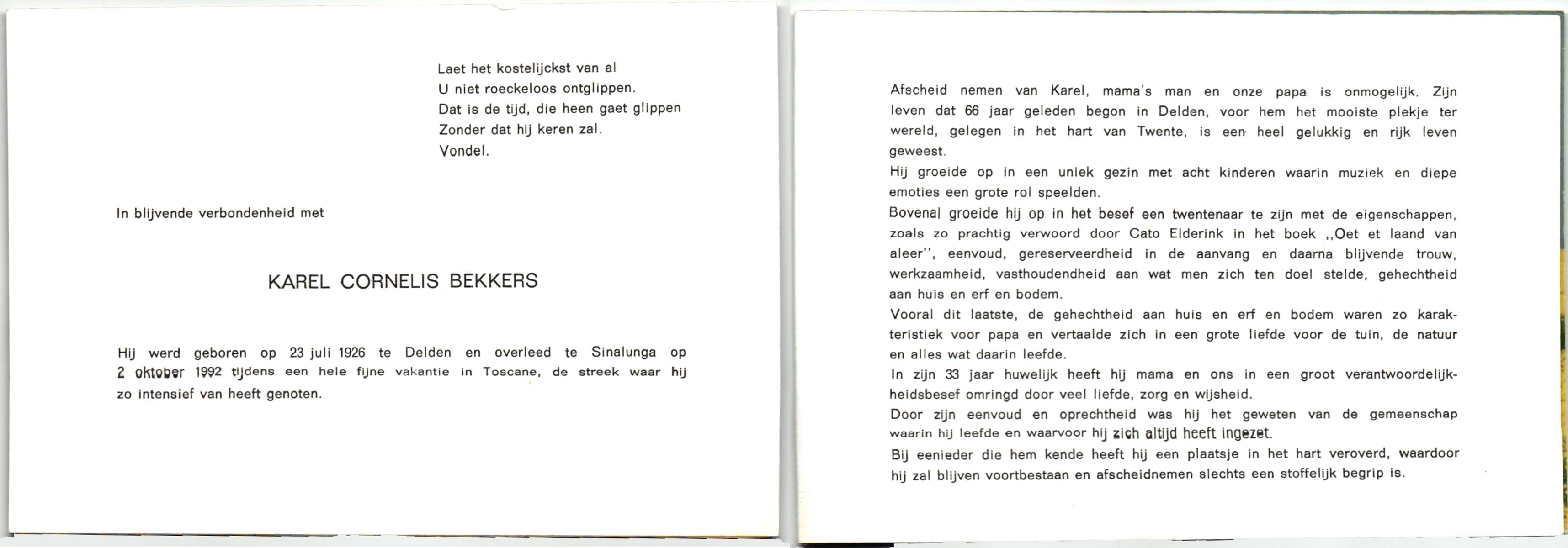 BEKKERS, , Karel Cornelis, geboren op 23-7-1926 te Delden, overleden op 2-10-1992 te Sinalunga, It. op 66-jarige leeftijd.