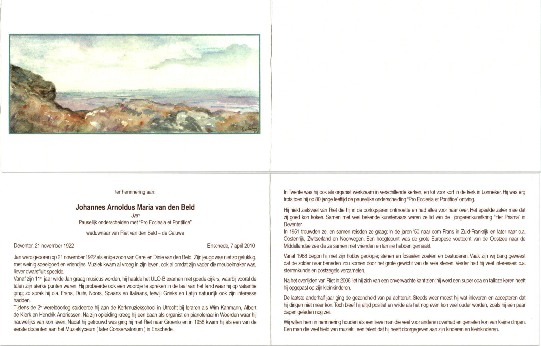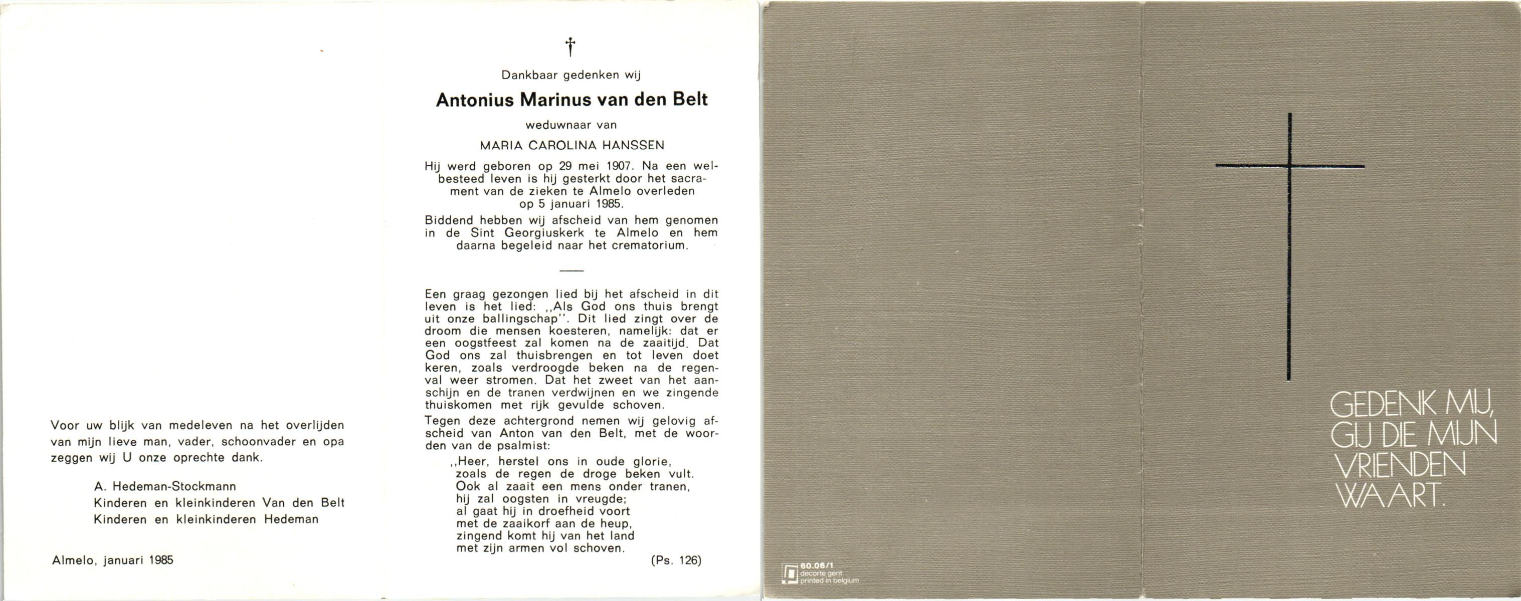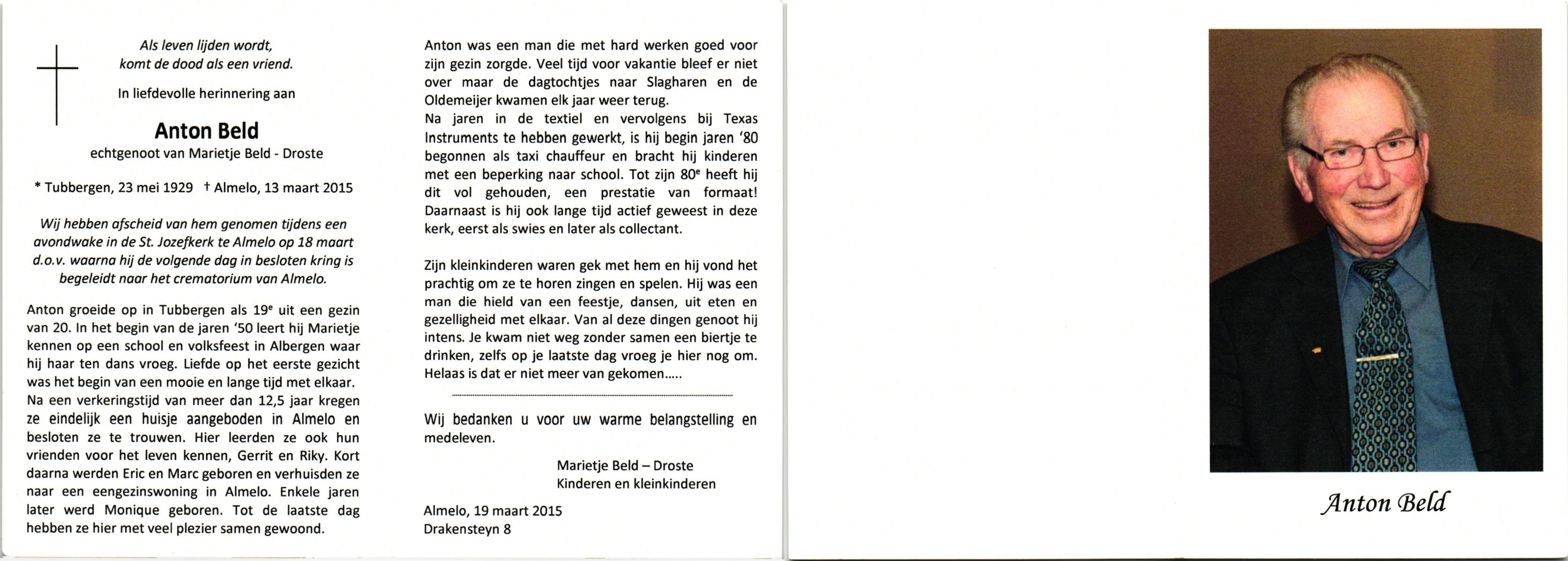 BELD, Anton, geboren op 23-5-1929 te Tubbergen, overleden op 13-3-2015 te Almelo op 85-jarige leeftijd, gecremeerd op 18-3-2015 te Almelo.