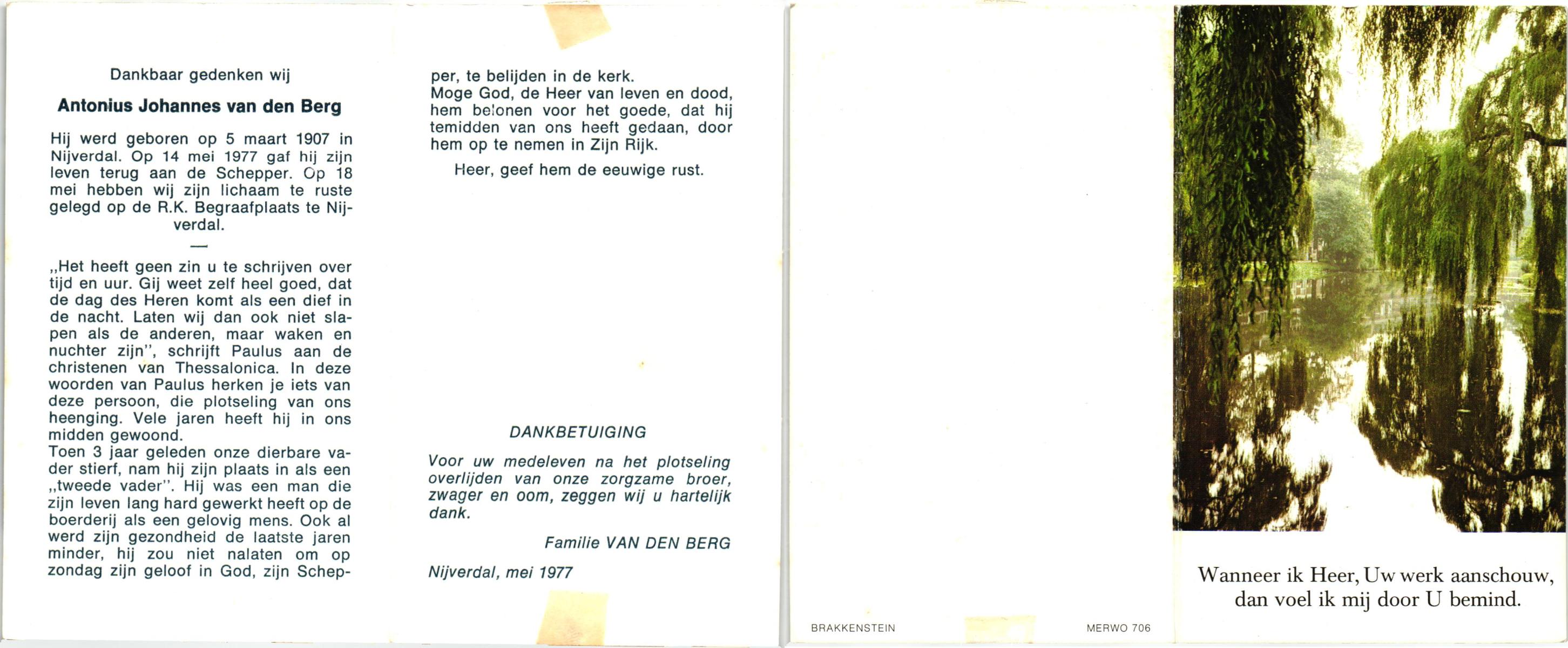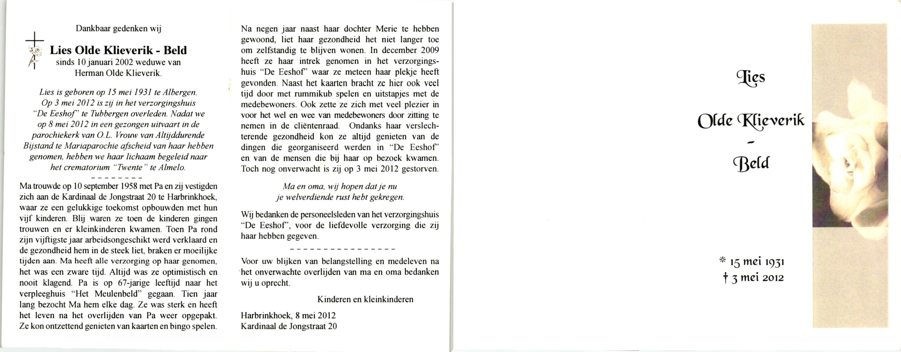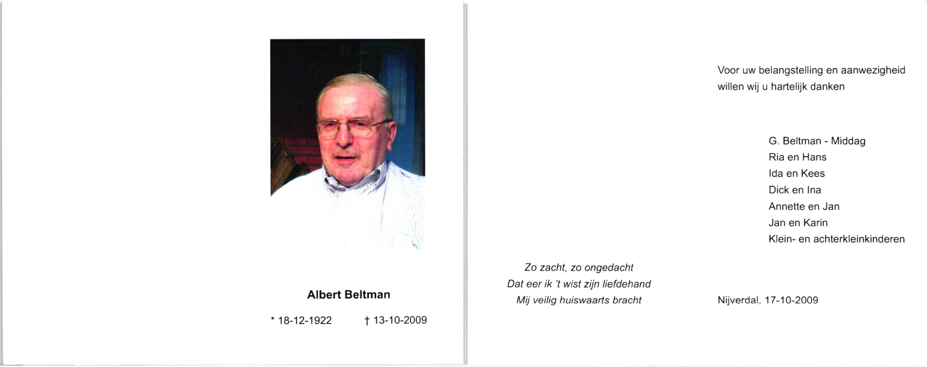 BELD, Anton, geboren op 23-5-1929 te Tubbergen, overleden op 13-3-2015 te Almelo op 85-jarige leeftijd, gecremeerd op 18-3-2015 te Almelo.
