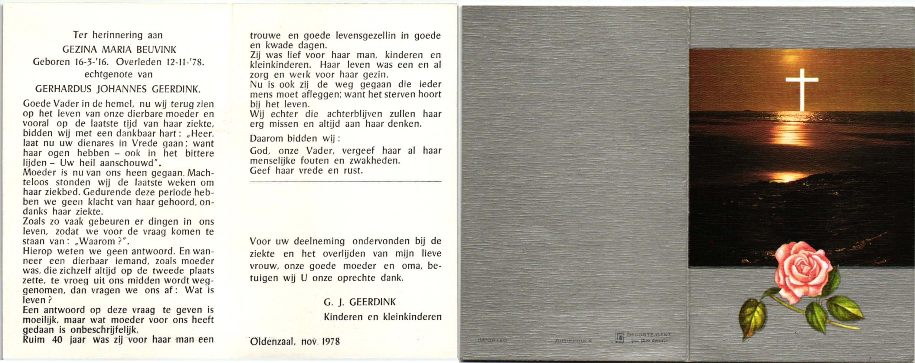 BEUVINK, , Gezina Maria, geboren op 16-3-1916, overleden op 12-11-1978 op 62-jarige leeftijd.