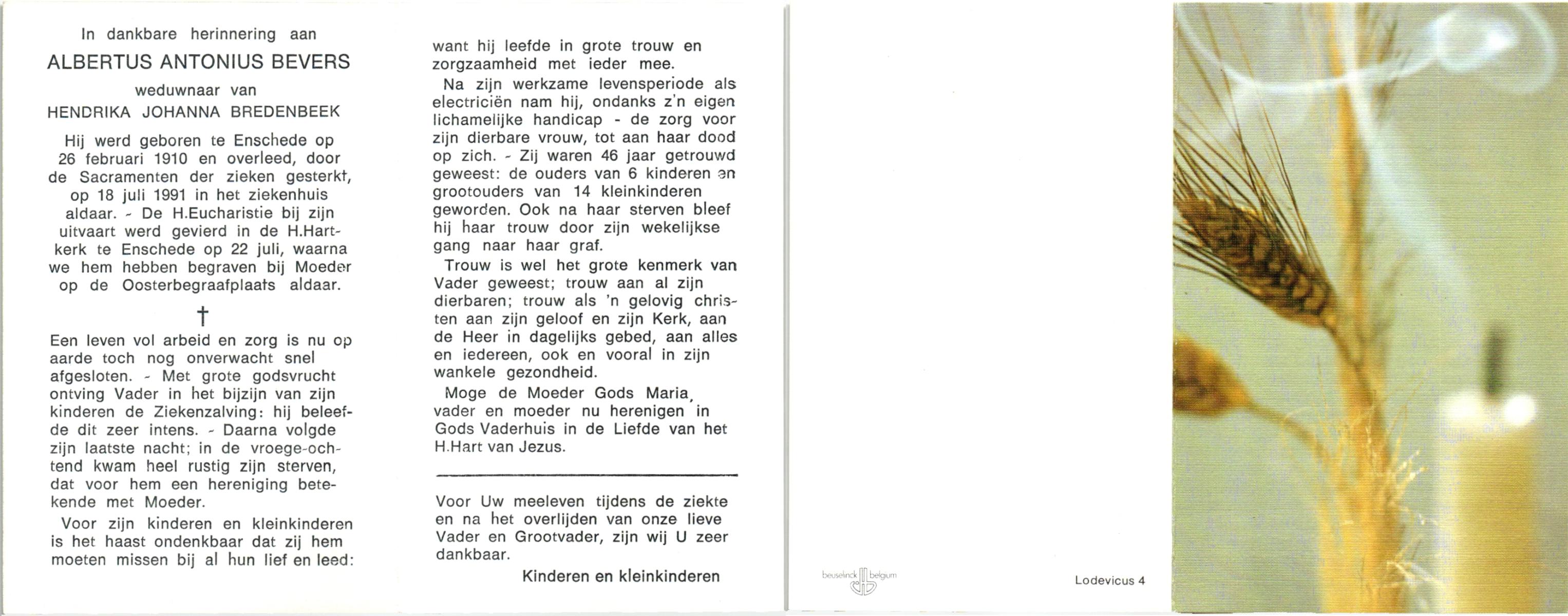 BEVERS, , Albertus Antonius, geboren op 26-2-1910 te Enschede, overleden op 18-7-1991 te Enschede op 81-jarige leeftijd, begraven op 22-7-1991 te Enschede.
