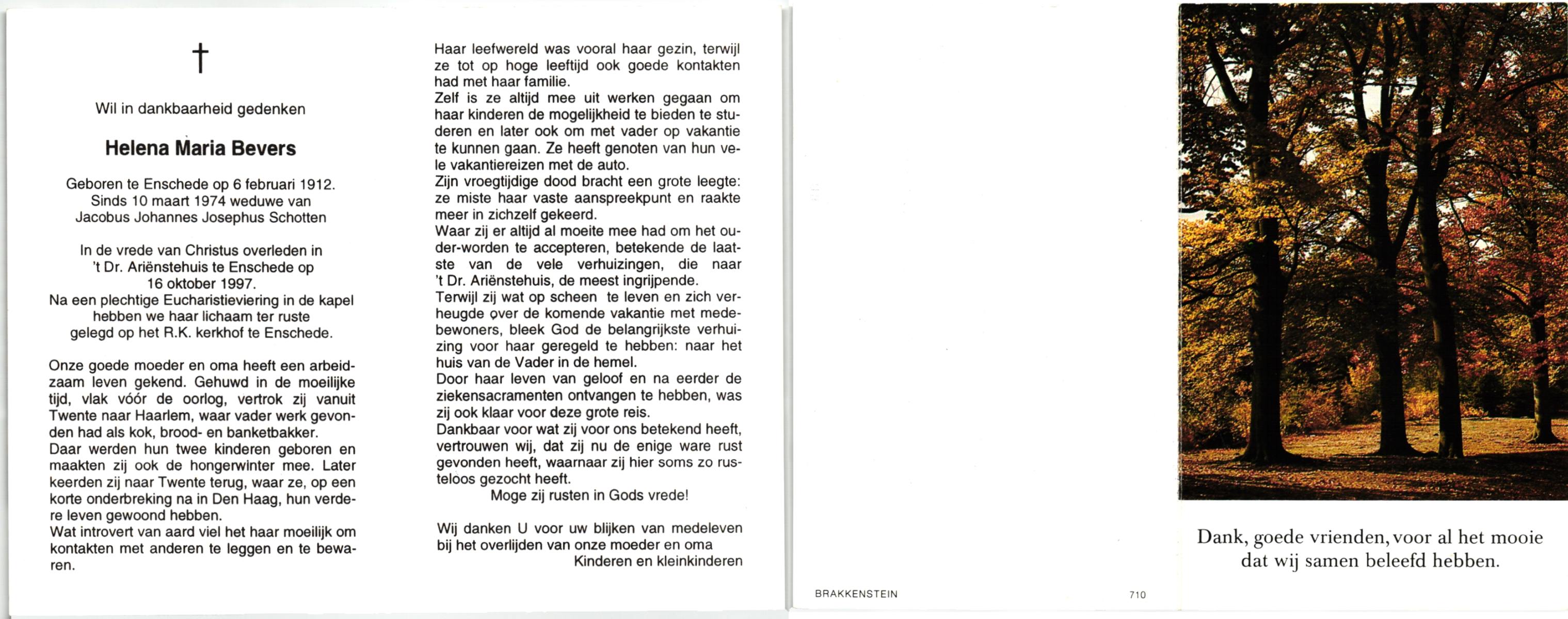 BEVERS, , Helena Maria, geboren op 6-2-1912 te Enschede, overleden op 16-10-1997 te Enschede op 85-jarige leeftijd, begraven te Enschede.