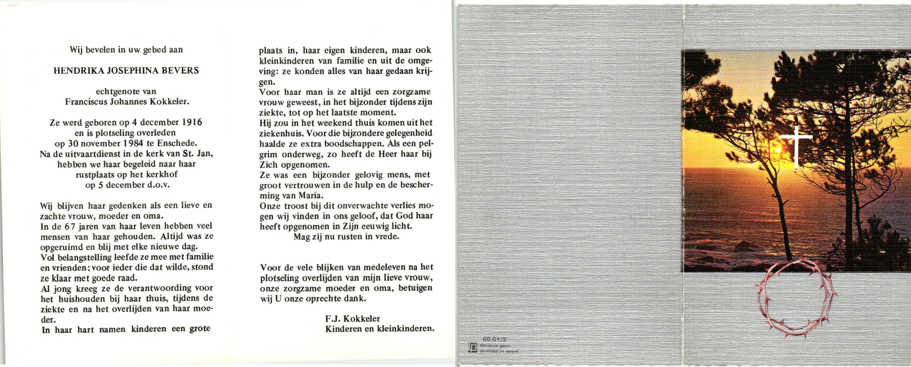 BEVERS, , Hendrika Josephina, geboren op 4-12-1916 te Enschede, overleden op 30-11-1984 te Enschede op 67-jarige leeftijd, begraven op 5-12-1984 te Enschede.